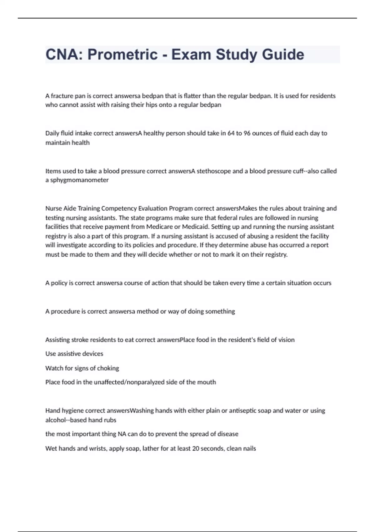 A fracture pan is correct answersa bedpan that is flatter than the regular bedpan. It is used for residents who cannot assist with raising their hips onto a regular bedpan Daily fluid intake correct answersA healthy person should take in 64 to 96 ounces of fluid each day to maintain health Items used to take a blood pressure correct answersA stethoscope and a blood pressure cuff--also called a sphygmomanometer Nurse Aide Training Competency Evaluation Program correct answersMakes the rules about training and testing nursing assistants. The state programs make sure that federal rules are followed in nursing facilities that receive payment from Medicare or Medicaid. Setting up and running the nursing assistant registry is also a part of this program. If a nursing assistant is accused of abusing a resident the facility will investigate according to its policies and procedure. If they determine abuse has occurred a report must be made to them and they will decide whether or not to mark it on their registry. A policy is correct answersa course of action that should be taken every time a certain situation occurs A procedure is correct answersa method or way of doing something Assisting stroke residents to eat correct answersPlace food in the resident's field of vision Use assistive devices Watch for signs of choking Place food in the unaffected/nonparalyzed side of the mouth Hand hygiene correct answersWashing hands with either plain or antiseptic soap and water or using alcohol--based hand rubs the most important thing NA can do to prevent the spread of disease Wet hands and wrists, apply soap, lather for at least 20 seconds, clean nails