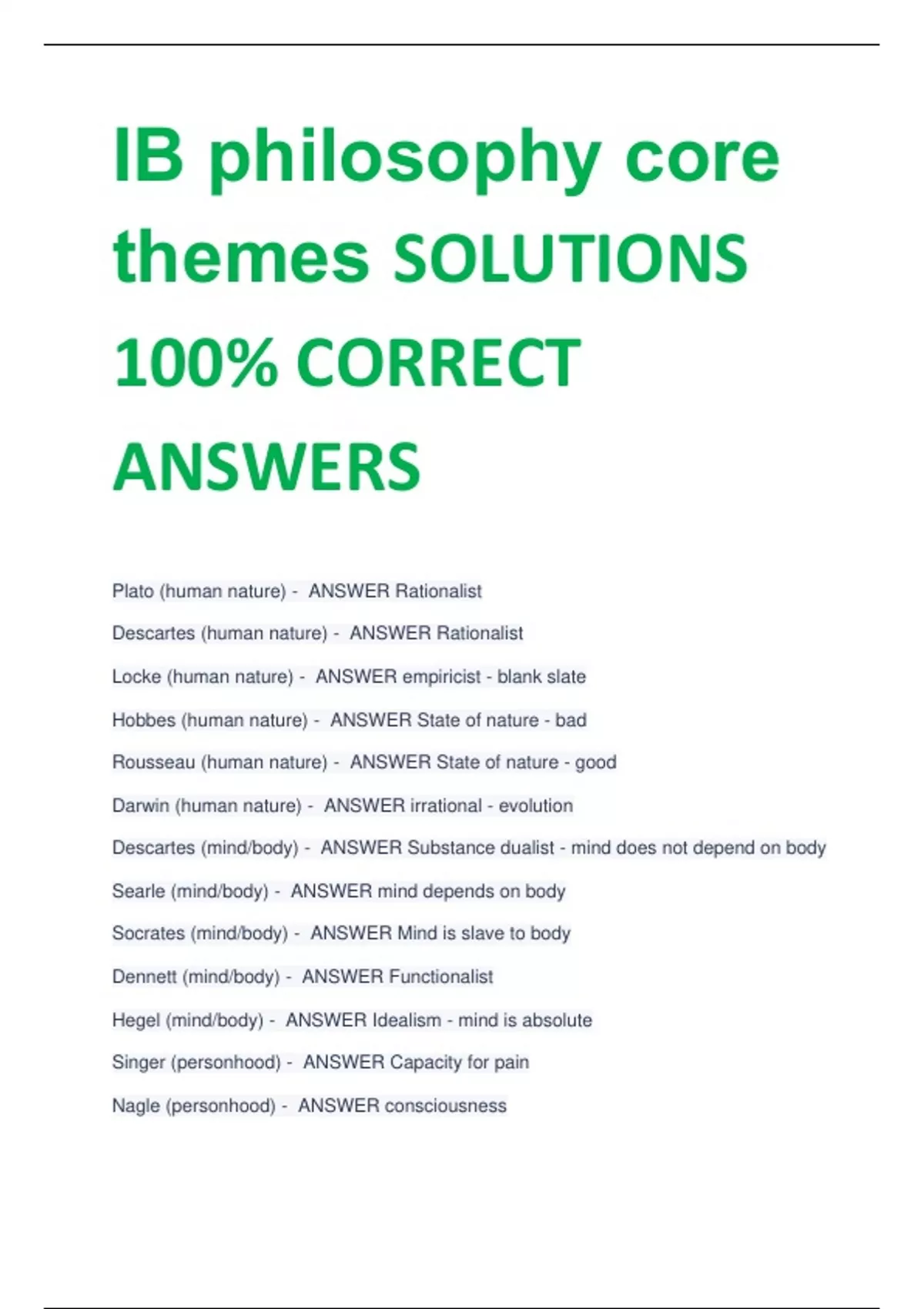 IB philosophy core themes SOLUTIONS 100% CORRECT ANSWERS Plato (human nature) - ANSWER Rationalist Descartes (human nature) - ANSWER Rationalist Locke (human nature) - ANSWER empiricist - blank slate Hobbes (human nature) - ANSWER State of nature - bad Rousseau (human nature) - ANSWER State of nature - good Darwin (human nature) - ANSWER irrational - evolution Descartes (mind/body) - ANSWER Substance dualist - mind does not depend on body Searle (mind/body) - ANSWER mind depends on body Socrates (mind/body) - ANSWER Mind is slave to body Dennett (mind/body) - ANSWER Functionalist Hegel (mind/body) - ANSWER Idealism - mind is absolute Singer (personhood) - ANSWER Capacity for pain Nagle (personhood) - ANSWER consciousness