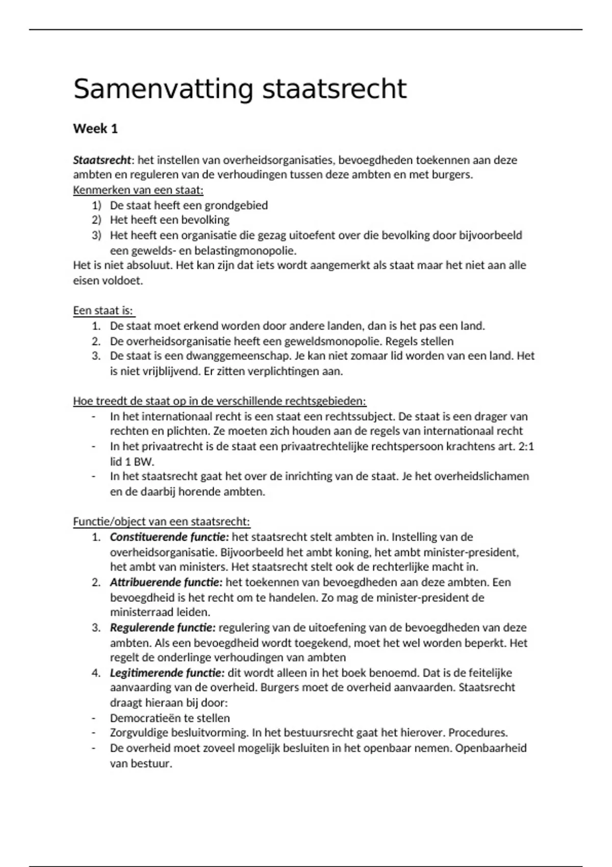 Samenvatting - Staats en Bestuursrecht (JUR-1STABER)