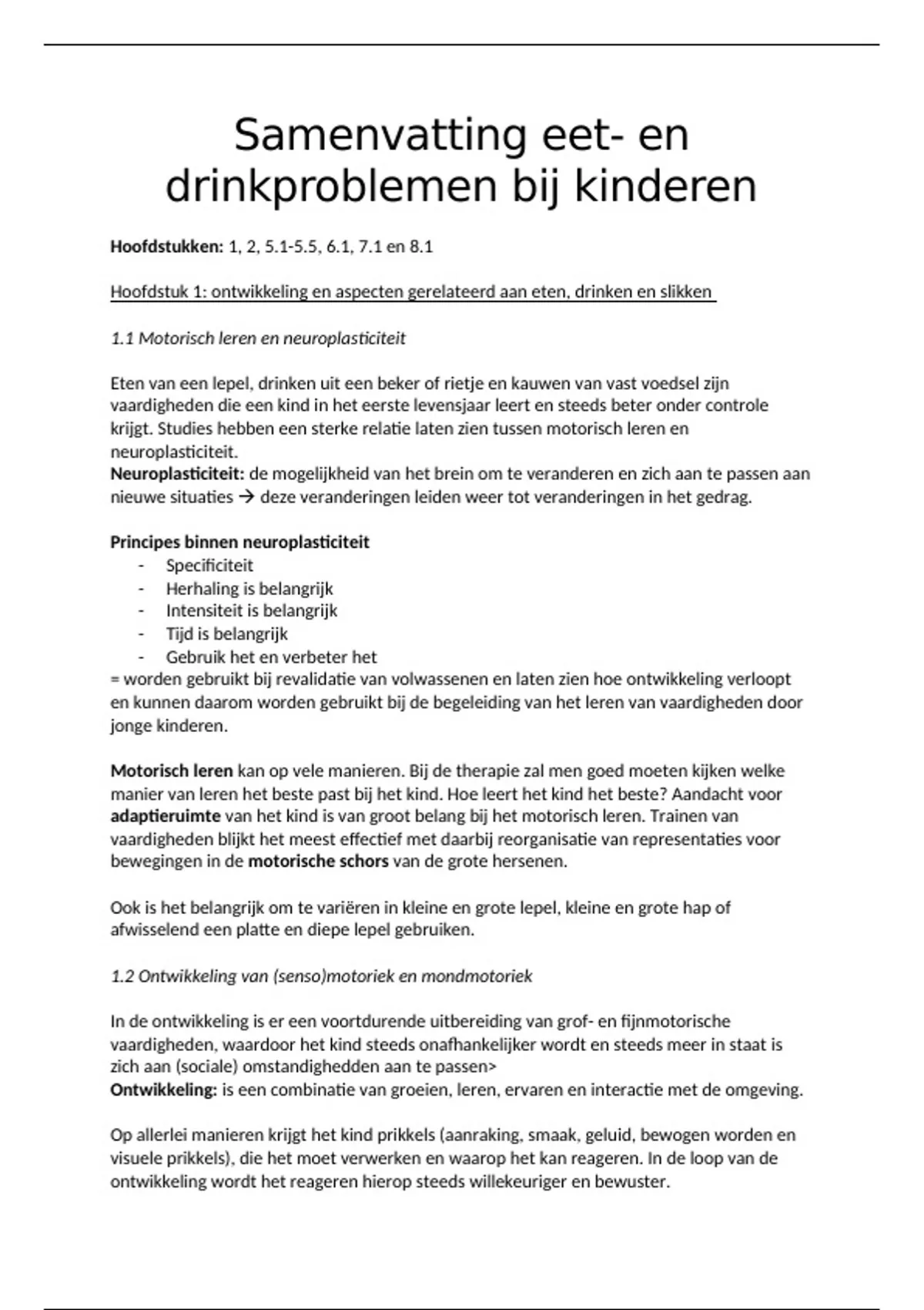 In het document is het boek eet- en drinkproblemen bij jonge kinderen gedeeltelijk samengevat (H1. H2. H5.1-5.5, H6.1, H7.1 en H8.1). de samenvatting hoort bij de opleiding logopedie en het van Baby, peuter, kleuter.