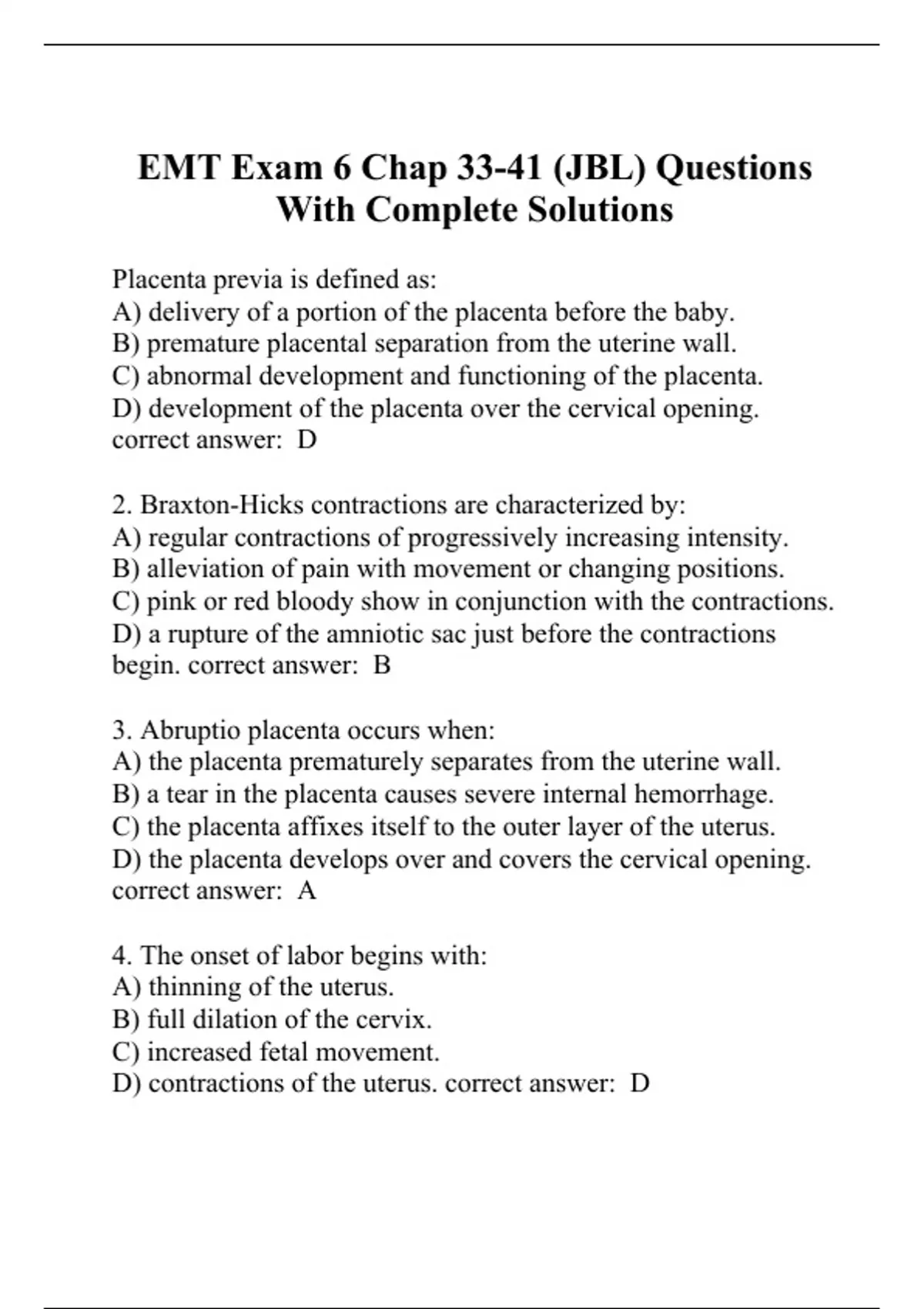 Placenta previa is defined as: A) delivery of a portion of the placenta before the baby. B) premature placental separation from the uterine wall. C) abnormal development and functioning of the placenta. D) development of the placenta over the cervical opening. correct answer: D 2. Braxton-Hicks contractions are characterized by: A) regular contractions of progressively increasing intensity. B) alleviation of pain with movement or changing positions. C) pink or red bloody show in conjunction with the contractions. D) a rupture of the amniotic sac just before the contractions begin. correct answer: B 3. Abruptio placenta occurs when: A) the placenta prematurely separates from the uterine wall. B) a tear in the placenta causes severe internal hemorrhage. C) the placenta affixes itself to the outer layer of the uterus. D) the placenta develops over and covers the cervical opening. correct answer: A 4. The onset of labor begins with: A) thinning of the uterus. B) full dilation of the cervix. C) increased fetal movement. D) contractions of the uterus. correct answer: D 5. Supine hypotensive syndrome occurs when: A) a supine position kinks the ascending aorta. B) the pregnant uterus compresses the inferior vena cava. C) the superior vena cava is compressed by the uterus. D) blood pressure decreases as a result of hypovolemia. correct answer: B 6. Following delivery of the placenta, the mother is experiencing vaginal bleeding. After massaging the uterine fundus and allowing the mother to breastfeed, the bleeding stops. This occurred because: A) breastfeeding causes uterine blood vessels to dilate. B) a portion of the placenta was retained in the uterus. C) uterine massage increases blood flow to the uterus. D) these actions simulate the production of oxytocin and cause uterine contraction. correct answer: D 7. You have just delivered a baby boy. His body is pink, but his hands and feet are blue. His heart rate is approximately 110 beats/min and his respirations are rapid and irregular. He has a weak cry when stimulated and resists attempts to straighten his legs. His Apgar score is: A) 6 B) 7 C) 8 D) 9 correct answer: C 8. You have just delivered a premature baby. Your assessment reveals that he is breathing adequately; however, his heart rate is 90 beats/min. You should: A) keep him warm and ventilate with a BVM. B) begin chest compressions and reassess in 30 seconds. C) clamp and cut the umbilical cord and keep him warm. D) assess his skin color and give free-flow oxygen as needed. correct answer: A 9. Which of the following occurs during true labor? A) Uterine contractions decrease in intensity. B) The uterus becomes very soft and movable. C) Uterine contractions become more regular. D) Uterine contractions last about 10 seconds. correct answer: C 10. Which of the following is NOT generally considered an obstetrical emergency? A) Failure of the placenta to deliver after 30 minutes B) Significant bleeding after delivery of the placenta C) Return of contractions following delivery of the baby D) More than 500 mL of blood loss before placental delivery correct answer: C 11. If a baby is born at 7:52, the second Apgar score should be calculated at: A) 7:53. B) 7:57. C) 7:59. D) 8:00. correct answer: B 12. The presence of meconium in the amniotic fluid indicates: A) an expected finding in full-term infants. B) that the baby's airway may be obstructed. C) that the fetus is at least 4 weeks premature. D) that full newborn resuscitation will be needed correct answer: B 13. You are attending to a 23-year-old female patient who is 16 weeks pregnant with her second child. The patient has apparently fallen and sustained an injury to her upper right arm. When you ask about the incident history, the patient is reluctant to explain what happened and becomes very quiet. Based on this information, you should: A) immediately remove the patient from the environment and transport. B) contact police and remain at the scene until they arrive and escort you to the hospital. C) ask more detailed questions and press the issue until you have a more detailed understanding of the incident. D) continue your care in a private area, document any details regarding the scene and the incident, and reassure her as you provide care. correct answer: D 14. A nuchal cord is defined as an umbilical cord that: A) has separated from the placenta. B) is wrapped around the baby's neck. C) is lacerated due to a traumatic delivery. D) has abnormally developed blood vessels. correct answer: B 15. Which of the following questions is of LEAST pertinence when determining whether a mother will deliver her baby within the next few minutes? A) "When are you due?" B) "Is this your first baby?" C) "Have you had a sonogram?" D) "Do you feel the need to push?" correct answer: C 16. By the 20th week of pregnancy, the uterus is typically at or above the level of the mother's: A) belly button. B) pubic bone. C) xiphoid process. D) superior diaphragm. correct answer: A 17. Common interventions used to stimulate spontaneous respirations in the newborn include all of the following, EXCEPT: A) suctioning of the upper airway. B) thorough drying with a towel. C) positive-pressure ventilations. D) some form of tactile stimulation. correct answer: C 18. A history of pelvic inflammatory disease or tubal ligations increases a woman's risk for: A) preeclampsia.