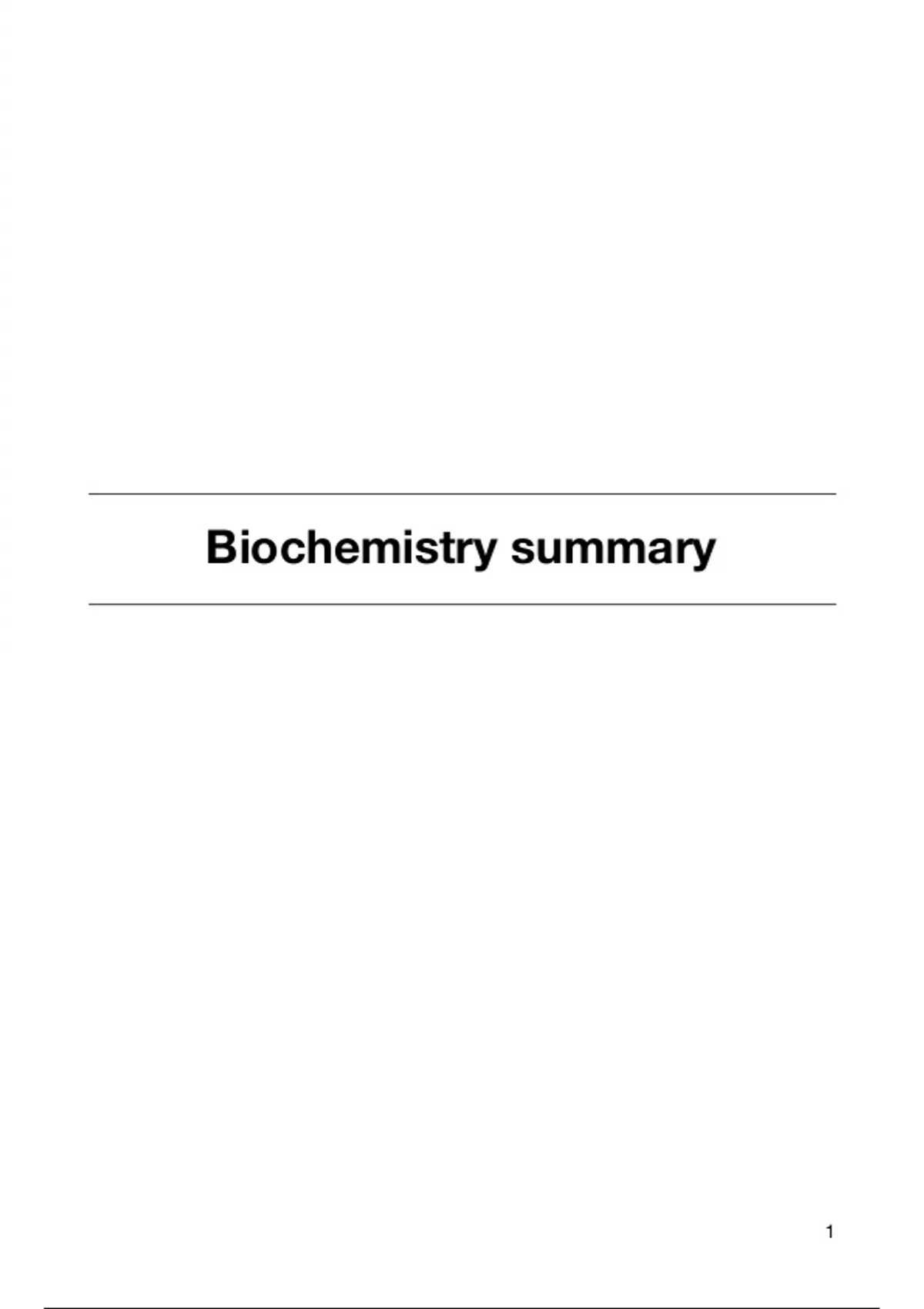 Complete summary of the course Biochemistry (AB_1137) from the 1st year of biomedical sciences, VU Amsterdam. This summary contains all information needed for the exam, and includes all the material from the lectures and the book that was required for this course. This summary was made during my first year of biomedical sciences (2020/2021). --- Volledige samenvatting van het vak Biochemistry (AB_1137) uit het 1e jaar biomedische wetenschappen, VU Amsterdam. Deze samenvatting bevat alle informatie die nodig is voor het examen en bevat alle stof uit de hoorcolleges en het boek dat nodig was voor dit vak. Deze samenvatting is gemaakt tijdens mijn eerste jaar biomedische wetenschappen (2020/2021).
