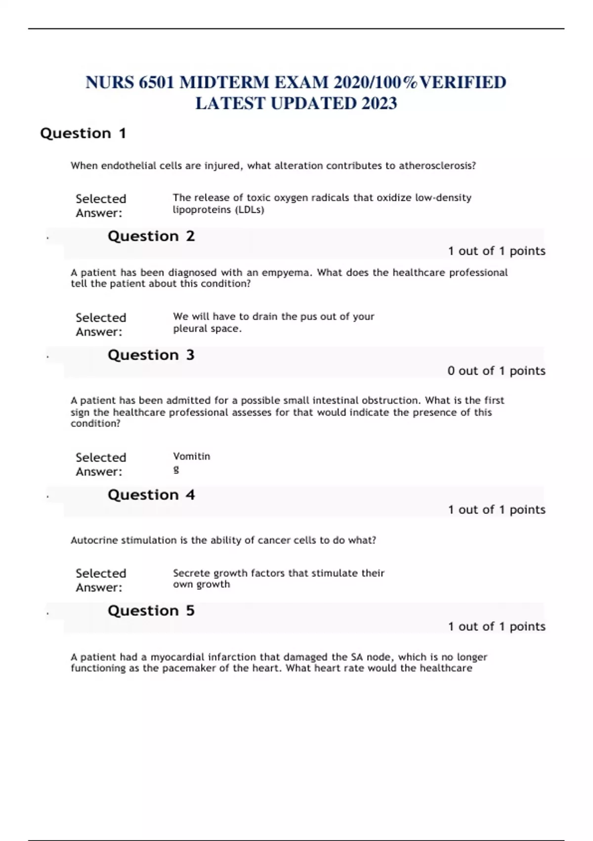 NURS 6501 MIDTERM EXAM 2020/100%VERIFIED LATEST UPDATED 2023 Question 1 When endothelial cells are injured, what alteration contributes to atherosclerosis? Selected Answer: The release of toxic oxygen radicals that oxidize low-density lipoproteins (LDLs) A patient has been diagnosed with an empyema. What does the healthcare professional tell the patient about this condition? Selected Answer: We will have to drain the pus out of your pleural space. A patient has been admitted for a possible small intestinal obstruction. What is the first sign the healthcare professional assesses for that would indicate the presence of this condition? Selected Answer: Vomitin g Autocrine stimulation is the ability of cancer cells to do what? Selected Answer: Secrete growth factors that stimulate their own growth