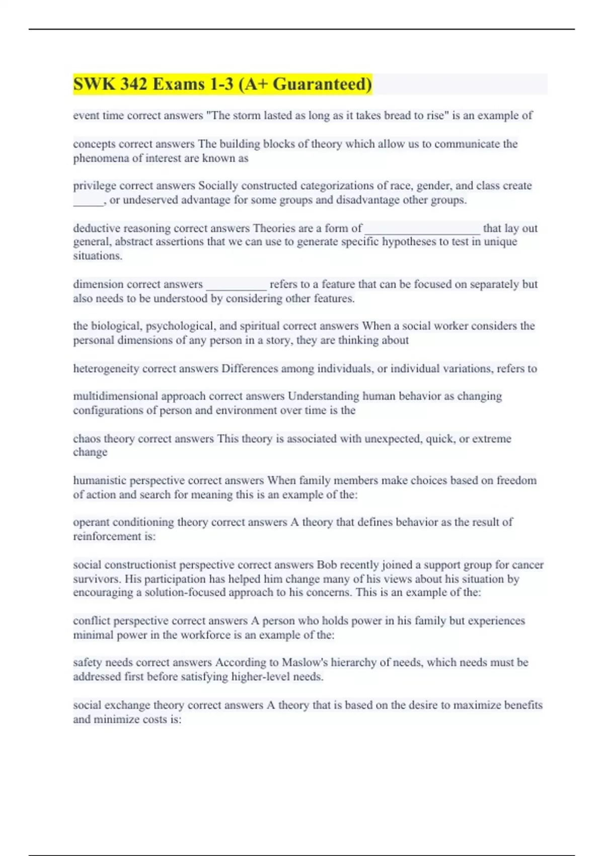 event time correct answers "The storm lasted as long as it takes bread to rise" is an example of concepts correct answers The building blocks of theory which allow us to communicate the phenomena of interest are known as privilege correct answers Socially constructed categorizations of race, gender, and class create _____, or undeserved advantage for some groups and disadvantage other groups. deductive reasoning correct answers Theories are a form of ___________________ that lay out general, abstract assertions that we can use to generate specific hypotheses to test in unique situations. dimension correct answers __________ refers to a feature that can be focused on separately but also needs to be understood by considering other features. the biological, psychological, and spiritual correct answers When a social worker considers the personal dimensions of any person in a story, they are thinking about heterogeneity correct answers Differences among individuals, or individual variations, refers to multidimensional approach correct answers Understanding human behavior as changing configurations of person and environment over time is the chaos theory correct answers This theory is associated with unexpected, quick, or extreme change humanistic perspective correct answers When family members make choices based on freedom of action and search for meaning this is an example of the: operant conditioning theory correct answers A theory that defines behavior as the result of reinforcement is: social constructionist perspective correct answers Bob recently joined a support group for cancer survivors. His participation has helped him change many of his views about his situation by encouraging a solution-focused approach to his concerns. This is an example of the: conflict perspective correct answers A person who holds power in his family but experiences minimal power in the workforce is an example of the: safety needs correct answers According to Maslow's hierarchy of needs, which needs must be addressed first before satisfying higher-level needs. social exchange theory correct answers A theory that is based on the desire to maximize benefits and minimize costs is: