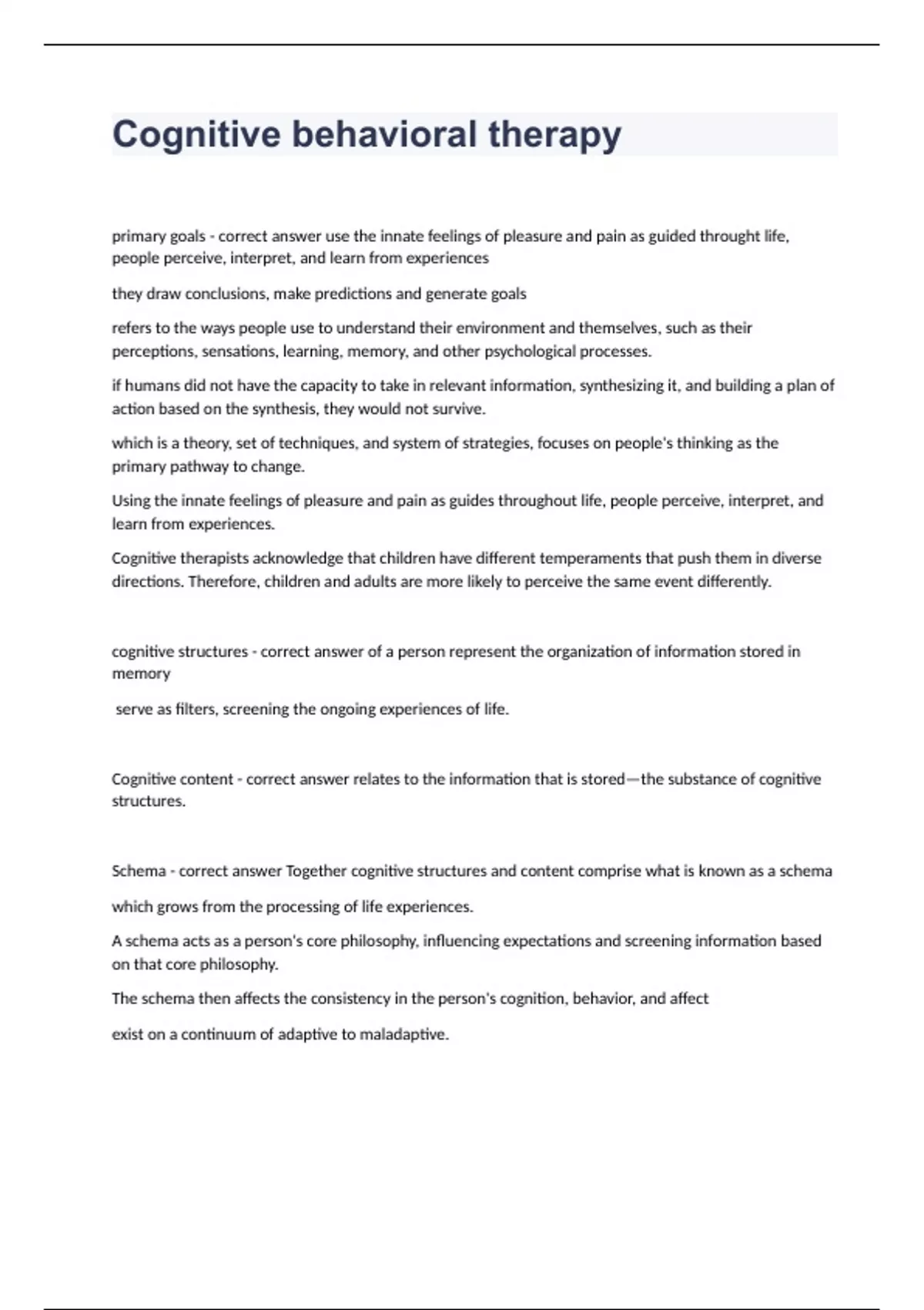 Schema - correct answer Together cognitive structures and content comprise what is known as a schema