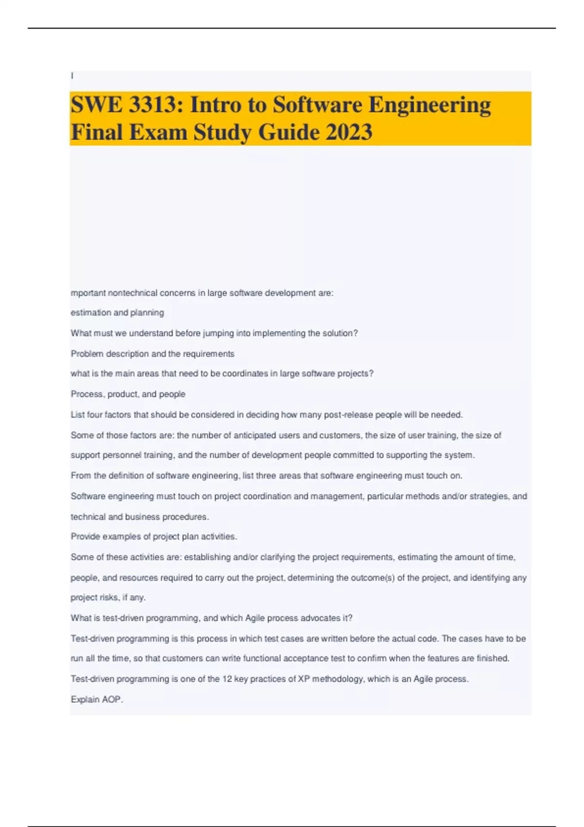 SWE 3313: Intro to Software Engineering Final Exam Study Guide 2023