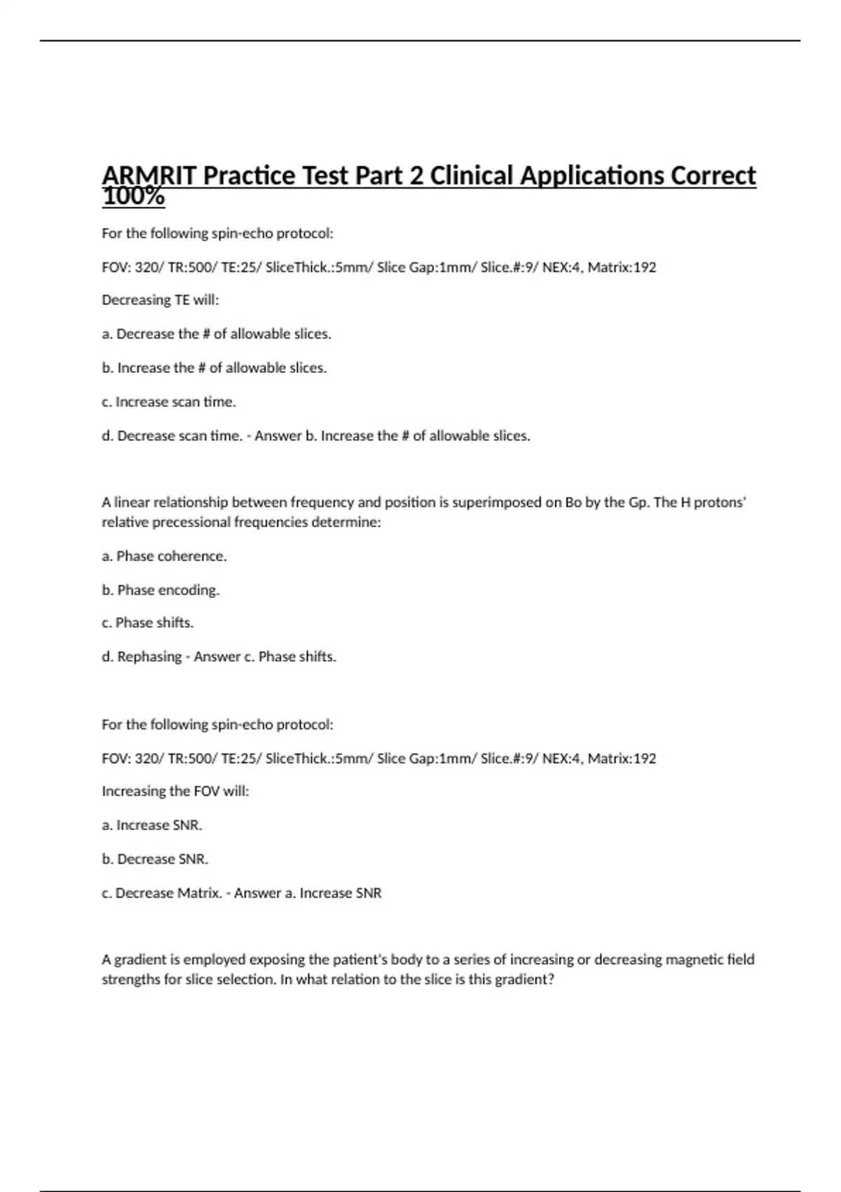 For the following spin-echo protocol: FOV: 320/ TR:500/ TE:25/ SliceThick.:5mm/ Slice Gap:1mm/ Slice.#:9/ NEX:4, Matrix:192 Decreasing TE will: a. Decrease the # of allowable slices. b. Increase the # of allowable slices. c. Increase scan time. d. Decrease scan time. - Answer b. Increase the # of allowable slices. A linear relationship between frequency and position is superimposed on Bo by the Gp. The H protons' relative precessional frequencies determine: a. Phase coherence. b. Phase encoding. c. Phase shifts. d. Rephasing - Answer c. Phase shifts. For the following spin-echo protocol: FOV: 320/ TR:500/ TE:25/ SliceThick.:5mm/ Slice Gap:1mm/ Slice.#:9/ NEX:4, Matrix:192 Increasing the FOV will: a. Increase SNR. b. Decrease SNR. c. Decrease Matrix. - Answer a. Increase SNR A gradient is employed exposing the patient's body to a series of increasing or decreasing magnetic field strengths for slice selection. In what relation to the slice is this gradient? a. Anti-parallel. b. Perpendicular. c. Parallel. d. Oblique. - Answer b. Perpendicular. In spatial localization, the "logical" Slice Selection Gradient is symbolized: a. Gz b. Gy c. Gx - Answer a. Gz The "best" technique for improving image quality is to increase: a. TR b. NEX c. Matrix d. FOV - Answer b. NEX The two types of enhancement media, described by Lauffer, the mechanism of T2 agents is: a. To increase T2 relaxation time, thus emitting low signal. b. To decrease T2 relaxation time, thus emitting low signal. c. To increase T2 relaxation time, thus emitting high signal. d. To decrease T2 relaxation time, thus emitting high signal - Answer b. To decrease T2 relaxation time, thus emitting low signal. The number (#) of slices formula is: a. TR x TE x delta. b. TR + TE + delta. c. TR / (TE+delta). - Answer c. TR / (TE+delta). A generation of frequency differences along a particular direction of a slice is called: a. Frequency encoding. b. Fourier transform. c. Phase encoding. d. Slice selection. - Answer a. Frequency encoding.