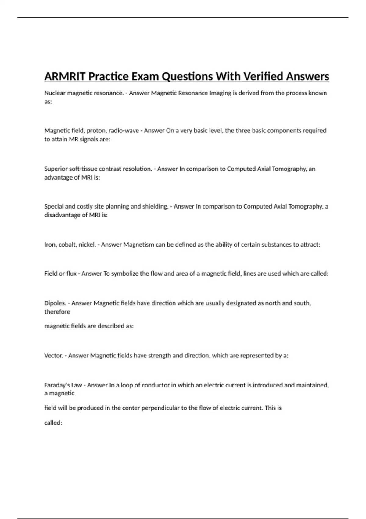 Nuclear magnetic resonance. - Answer Magnetic Resonance Imaging is derived from the process known as: Magnetic field, proton, radio-wave - Answer On a very basic level, the three basic components required to attain MR signals are: Superior soft-tissue contrast resolution. - Answer In comparison to Computed Axial Tomography, an advantage of MRI is: Special and costly site planning and shielding. - Answer In comparison to Computed Axial Tomography, a disadvantage of MRI is: Iron, cobalt, nickel. - Answer Magnetism can be defined as the ability of certain substances to attract: Field or flux - Answer To symbolize the flow and area of a magnetic field, lines are used which are called: Dipoles. - Answer Magnetic fields have direction which are usually designated as north and south, therefore magnetic fields are described as: Vector. - Answer Magnetic fields have strength and direction, which are represented by a: Faraday's Law - Answer In a loop of conductor in which an electric current is introduced and maintained, a magnetic field will be produced in the center perpendicular to the flow of electric current. This is called: Tesla. - Answer The strength of very large magnetic fields like those employed in MRI systems, the SI unit most commonly used is: 15,000 gauss - Answer A 1.5 Tesla magnetic field is equal to: 0.06 Tesla to 3 Tesla - Answer In the USA, MRI systems in clinical use have main magnetic field strengths that range from: Homogeneity. - Answer To describe the uniformity of the MRI system's main magnetic field, the term employed is: B0 - Answer In the USA, the MRI system's main magnetic field and the vector that represents it is symbolized: 20-30 PPM. - Answer The main magnetic field of MRI systems in clinical use must meet an acceptable specification of: H2O - Answer At any one time, human body tissue, in general, is made up of 50 - 90% of what substance? Odd number of total protons and neutrons. - Answer In MR imaging, for a chemical substance to be affected by the main magnetic field and the radio-wave it must contain an: H - Answer In clinical MR imaging of the human body, the substance of interest is: Magnetic moment - Answer Because of the spinning motion of the hydrogen proton it has the same properties as a bar magnet. The hydrogen proton's spinning motion gives it a: Resonance frequency - Answer In MRI, substances respond to a specific radio frequency which is known as: Larmor equation - Answer The resonance frequency of any substance in a magnetic field can be calculated by employing the: Gyro-magnetic ratio - Answer All chemical substances have an assigned constant known as the: wo = y x Bo - Answer Which of the following is the Larmor equation? Wavelength and frequency - Answer A sinewave is a symbol used to measure electromagnetic energy. A sinewave's two components of measurement are: