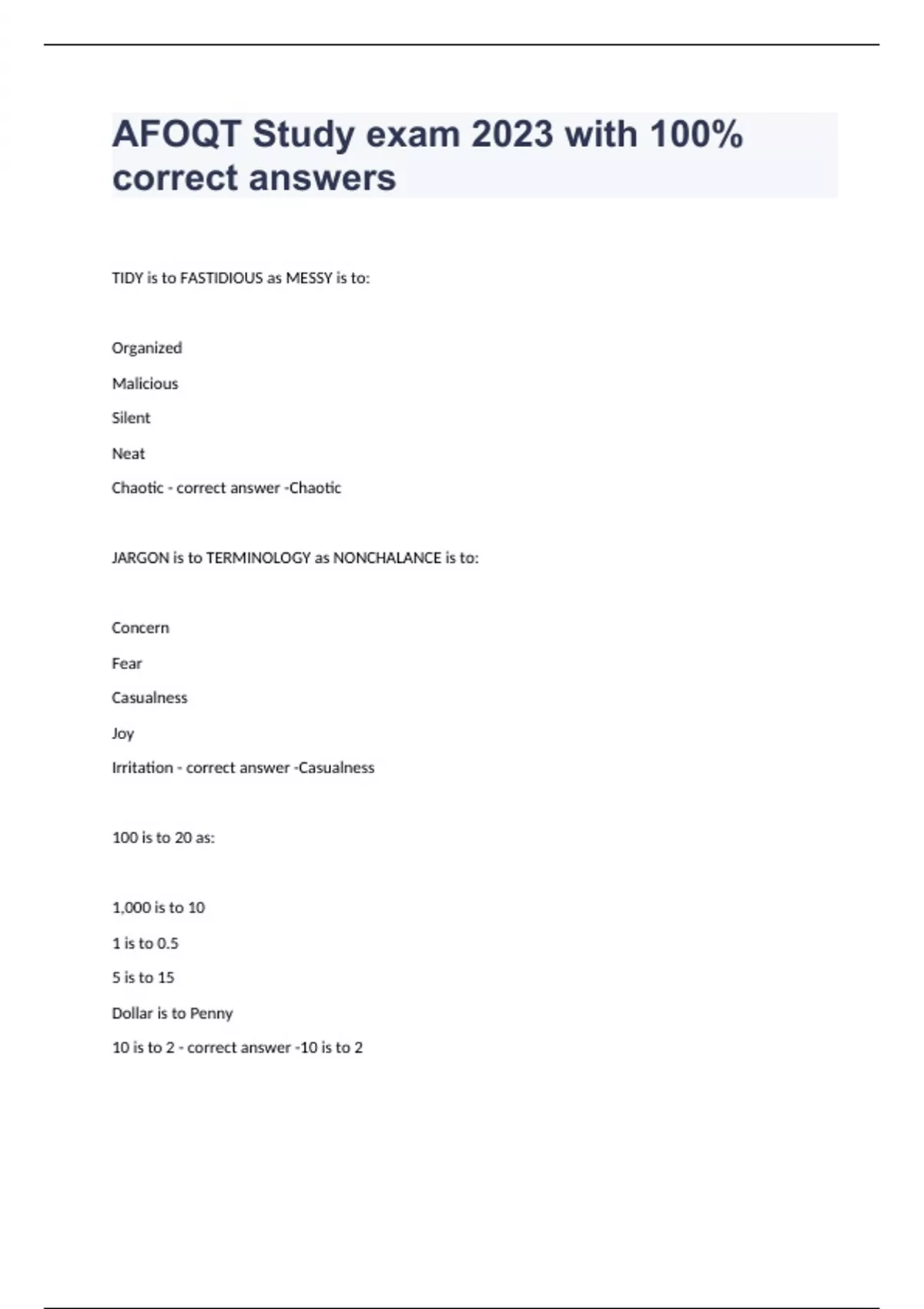 TIDY is to FASTIDIOUS as MESSY is to: Organized Malicious Silent Neat Chaotic - correct answer -Chaotic JARGON is to TERMINOLOGY as NONCHALANCE is to: Concern Fear Casualness Joy Irritation - correct answer -Casualness 100 is to 20 as: 1,000 is to 10 1 is to 0.5 5 is to 15 Dollar is to Penny 10 is to 2 - correct answer -10 is to 2 GENEROSITY is to GRATITUDE as: Sympathy is to Compassion Derision is to Humiliation Negligence is to Cautiousness Thoughtfulness is to Consideration Malice is to Cruelty - correct answer -Derision is to Humiliation FACILITATE is to ASSIST as OBLITERATE is to: Construct Create Question Bother Destroy - correct answer -Destroy Decade is to 10 as: Fingers are to 10 50 is to 500 13 is to 26 Century is to 100 Fifty is to 50 - correct answer -Century is to 100 ANTELOPE is to HERD as LION is to: Pride Troop Flock Zebra Pack - correct answer -Pride MARRED is to REPAIRED as EFFACED is to: Obliterated Highlighted Steadied Backed Disrespected - correct answer -Highlighted IRRIT