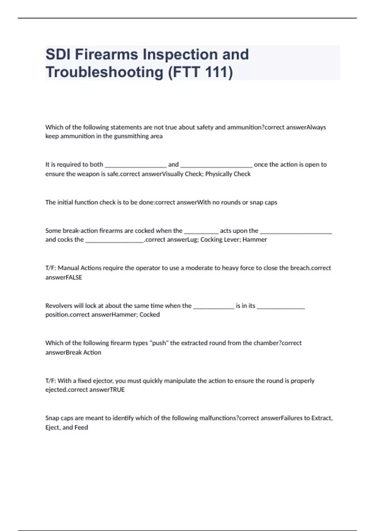 SDI Firearms Inspection and Troubleshooting (FTT 111)-exam with correct answers