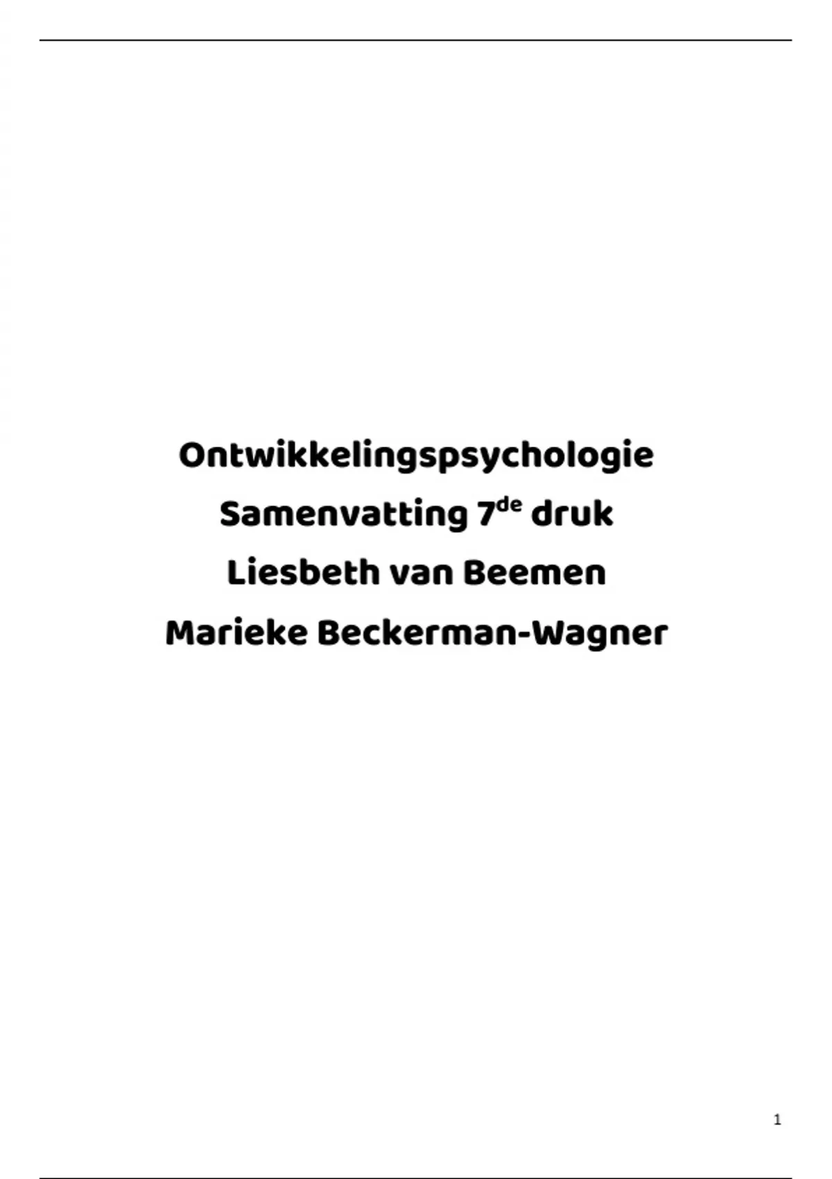 Een samenvatting van het boek Ontwikkelingspsychologie 7e druk van Liesbeth van Beelen en Marieke Beckerman-Wagner. Alle stof uit dit boek komt in deze samenvatting terug met heel veel begrippen + uitleg.