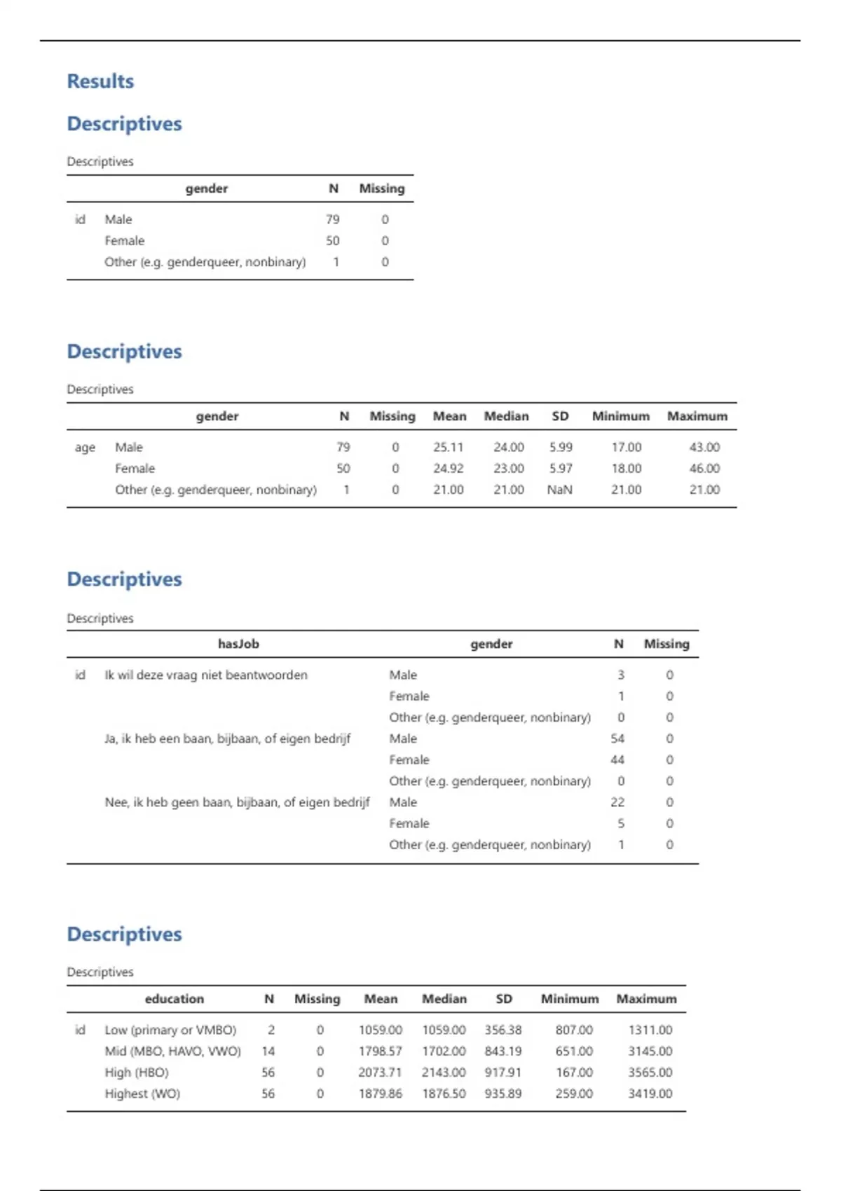 gender N Missing Mean Median SD Minimum Maximum