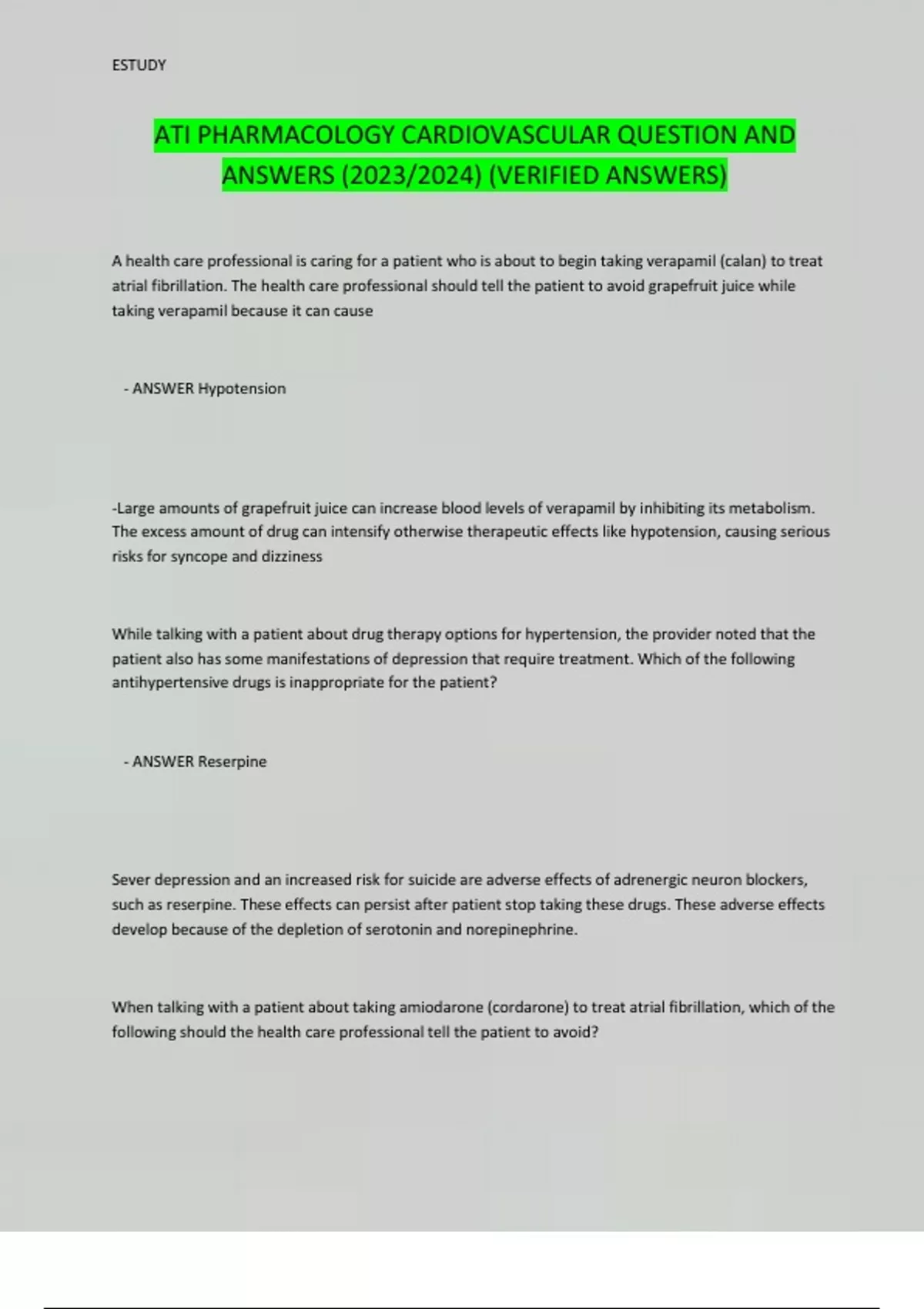 ATI PHARMACOLOGY CARDIOVASCULAR QUESTION AND ANSWERS (2023/2024) (VERIFIED ANSWERS)
