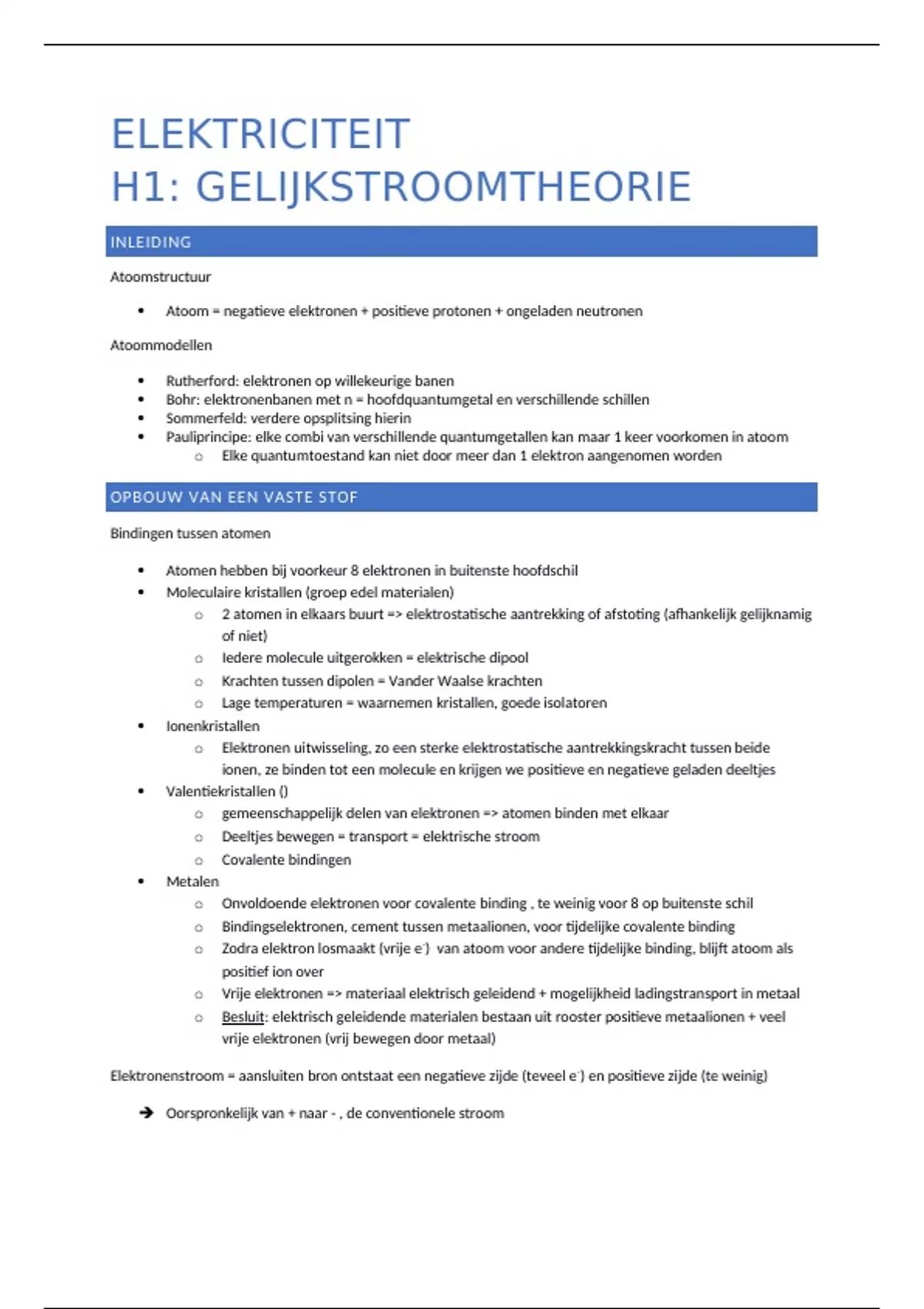 Elektronenstroom = aansluiten bron ontstaat een negatieve zijde (teveel e -) en positieve zijde (te weinig)