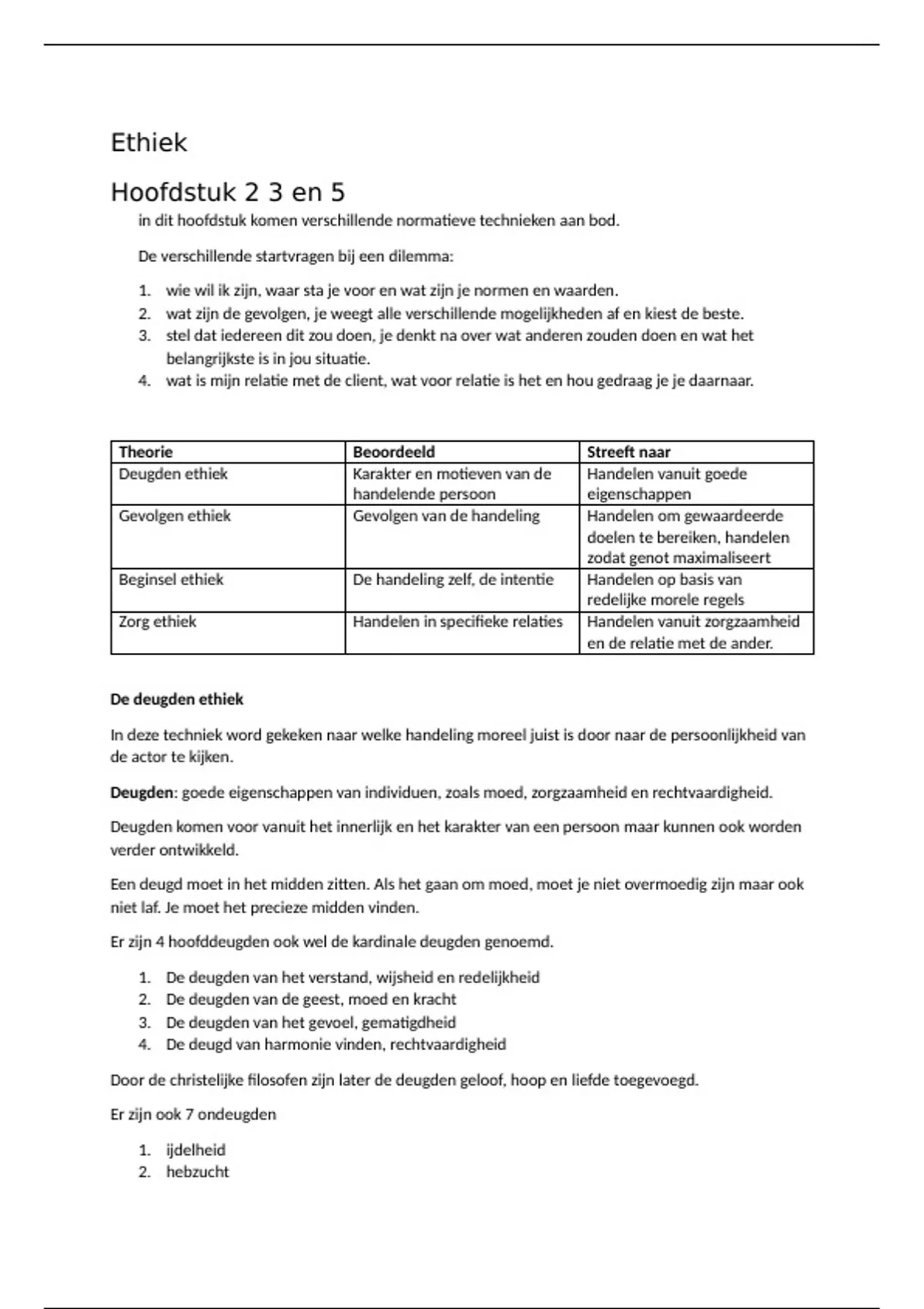 Deugden: goede eigenschappen van individuen, zoals moed, zorgzaamheid en rechtvaardigheid.