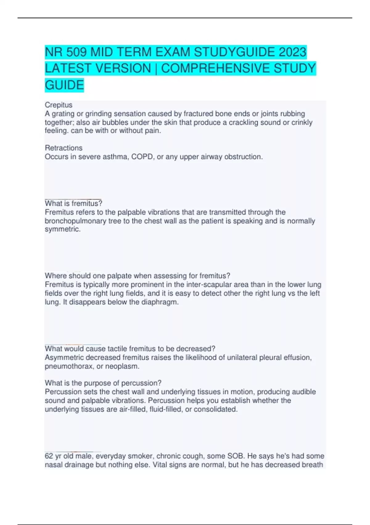 NR 509 MID TERM EXAM STUDYGUIDE 2023 LATEST VERSION | COMPREHENSIVE STUDY GUIDE Crepitus A grating or grinding sensation caused by fractured bone ends or joints rubbing together; also air bubbles under the skin that produce a crackling sound or crinkly feeling. can be with or without pain. Retractions Occurs in severe asthma, COPD, or any upper airway obstruction.