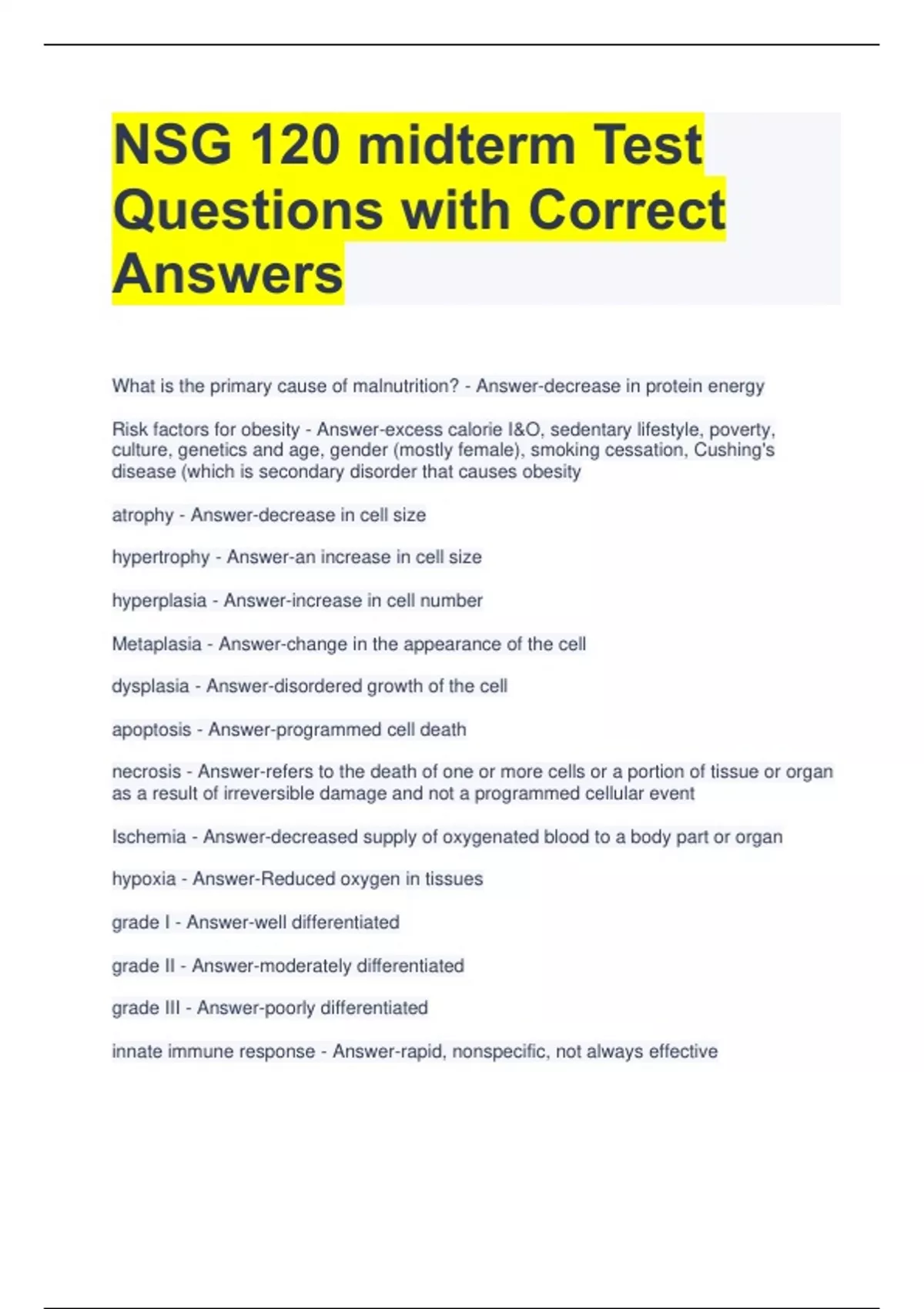 NSG 120 midterm Test Questions with Correct Answers What is the primary cause of malnutrition? - Answer-decrease in protein energy Risk factors for obesity - Answer-excess calorie I&O, sedentary lifestyle, poverty, culture, genetics and age, gender (mostly female), smoking cessation, Cushing's disease (which is secondary disorder that causes obesity atrophy - Answer-decrease in cell size hypertrophy - Answer-an increase in cell size hyperplasia - Answer-increase in cell number Metaplasia - Answer-change in the appearance of the cell dysplasia - Answer-disordered growth of the cell apoptosis - Answer-programmed cell death necrosis - Answer-refers to the death of one or more cells or a portion of tissue or organ as a result of irreversible damage and not a programmed cellular event Ischemia - Answer-decreased supply of oxygenated blood to a body part or organ hypoxia - Answer-Reduced oxygen in tissues grade I - Answer-well differentiated grade II - Answer-moderately differentiated grade III - Answer-poorly differentiated innate immune response - Answer-rapid, nonspecific, not always effective adaptive immune response - Answer-Specific, primed, memory, slow. 3rd line of defense- B & T cells, moral immunity, cell-mediated immunity