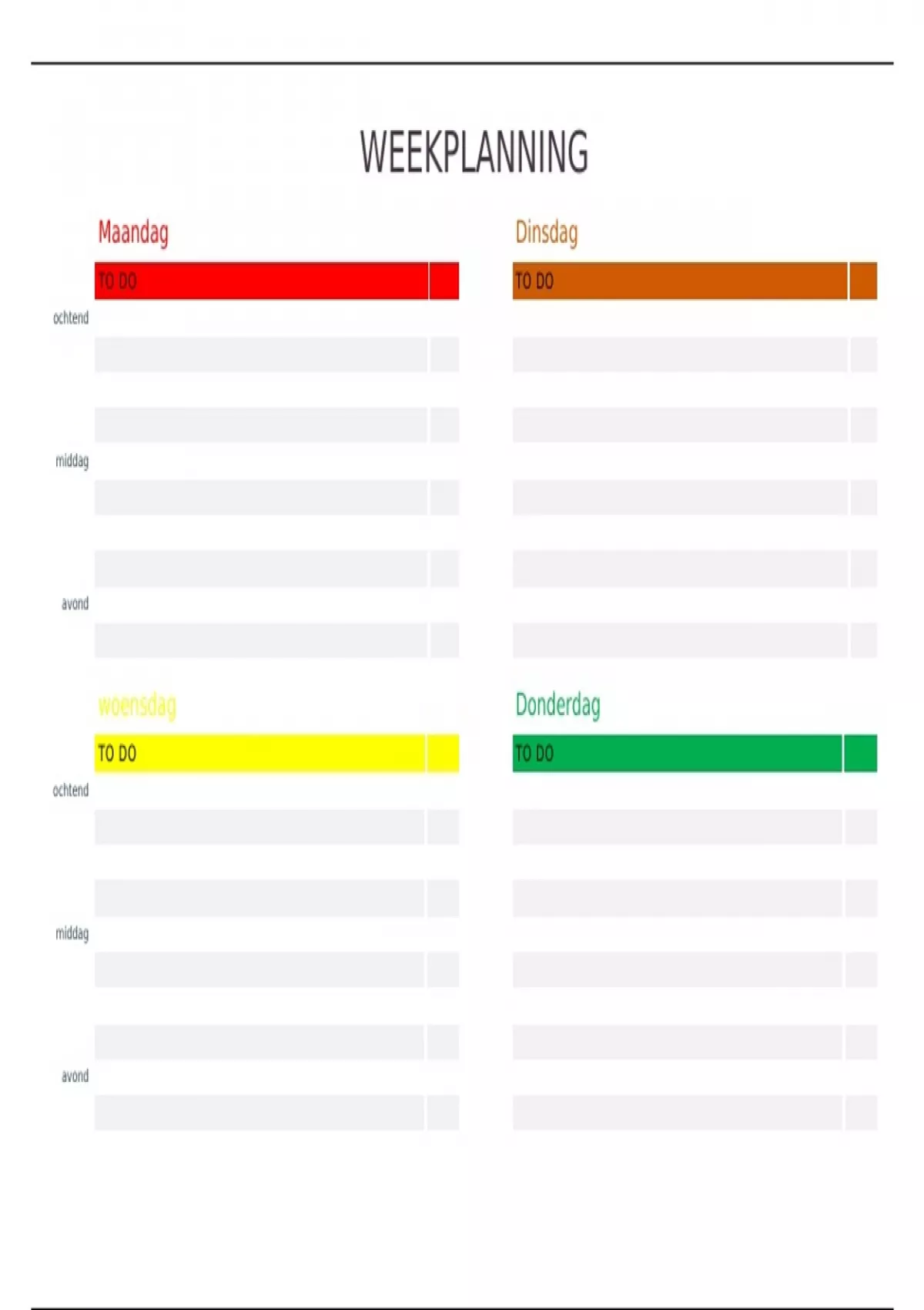 lege weekplanning. Plan je leermomenten of werkmomenten in. Houdt overzicht over je deadlines. Tip: print ui op A4 of A3 en lamineer de weekplanning. Je kunt dan met een stift je deadlines toevoegen en je planning iedere week opnieuw invullen :)