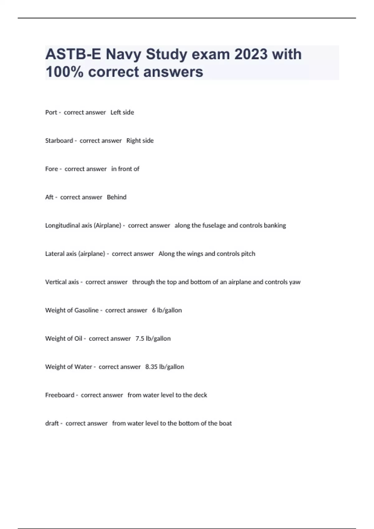 Port - correct answer Left side Starboard - correct answer Right side Fore - correct answer in front of Aft - correct answer Behind Longitudinal axis (Airplane) - correct answer along the fuselage and controls banking Lateral axis (airplane) - correct answer Along the wings and controls pitch Vertical axis - correct answer through the top and bottom of an airplane and controls yaw Weight of Gasoline - correct answer 6 lb/gallon Weight of Oil - correct answer 7.5 lb/gallon Weight of Water - correct answer 8.35 lb/gallon Freeboard - correct answer from water level to the deck draft - correct answer from water level to the bottom of the boat forecastle - correct answer bow half of the deck fantail - correct answer stern half of the deck Keel - correct answer Main centerline (backbone) of a vessel or the extension of hull that increases stability in the water Lubbers Line