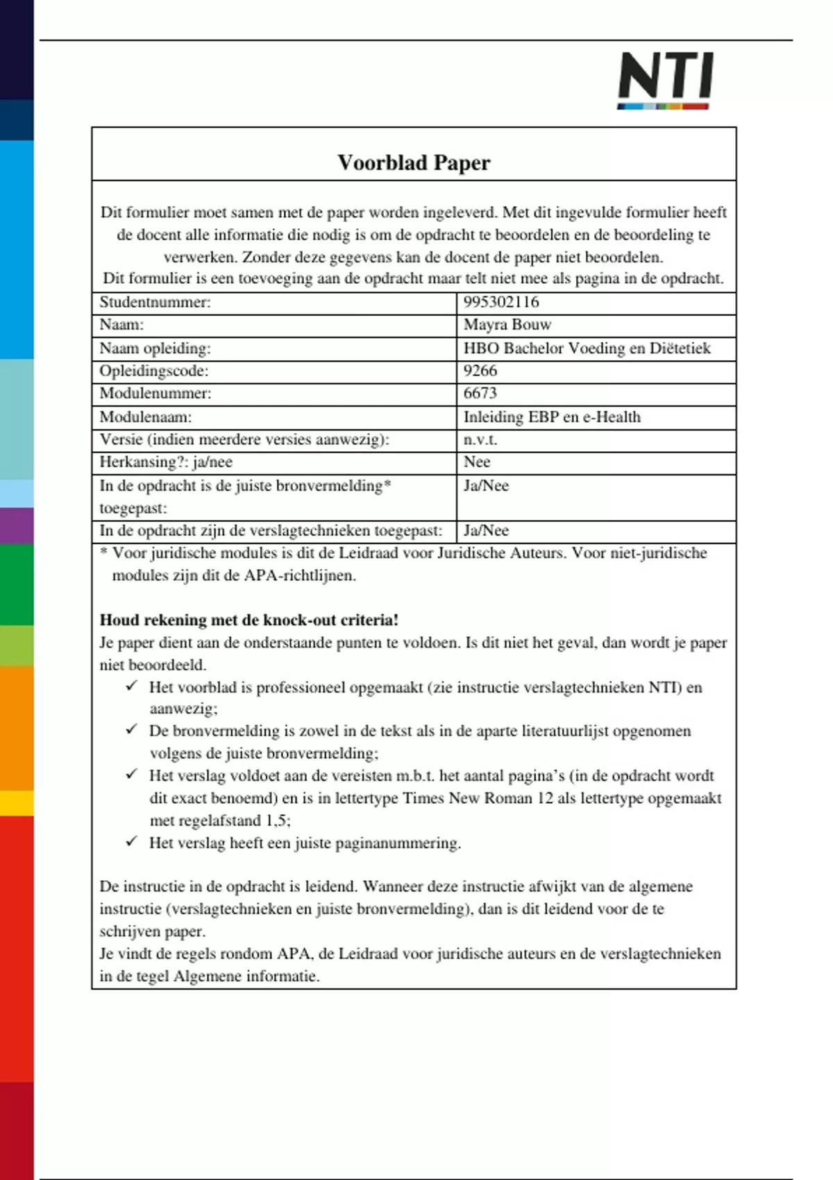 verwerken. Zonder deze gegevens kan de docent de paper niet beoordelen.