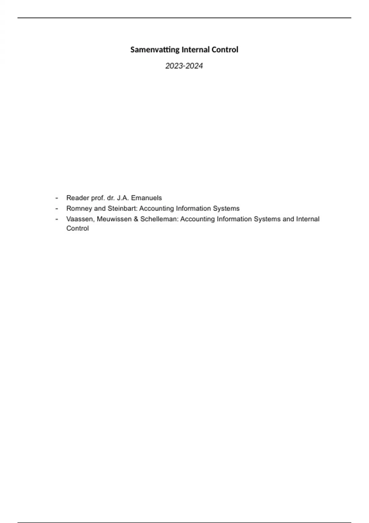 Ontdek de essentie van Internal Control met de samenvatting voor het academisch jaar 2023/2024. Deze samenvatting omvat de inhoud van de twee hoofdboeken en de reader die zijn voorgeschreven voor de cursus. De begrippen en rijtes zijn opzettelijk in het Engels zodat deze op de toets gemakkelijk herkend worden. In tegenstelling tot eerdere jaren ligt de nadruk op de pagina's die als toetsstof zijn gemarkeerd. Kort en krachtig, deze samenvatting is straight to the point, waardoor je tijd bespaart en je focust op de essentiële informatie voor succes in de cursus.