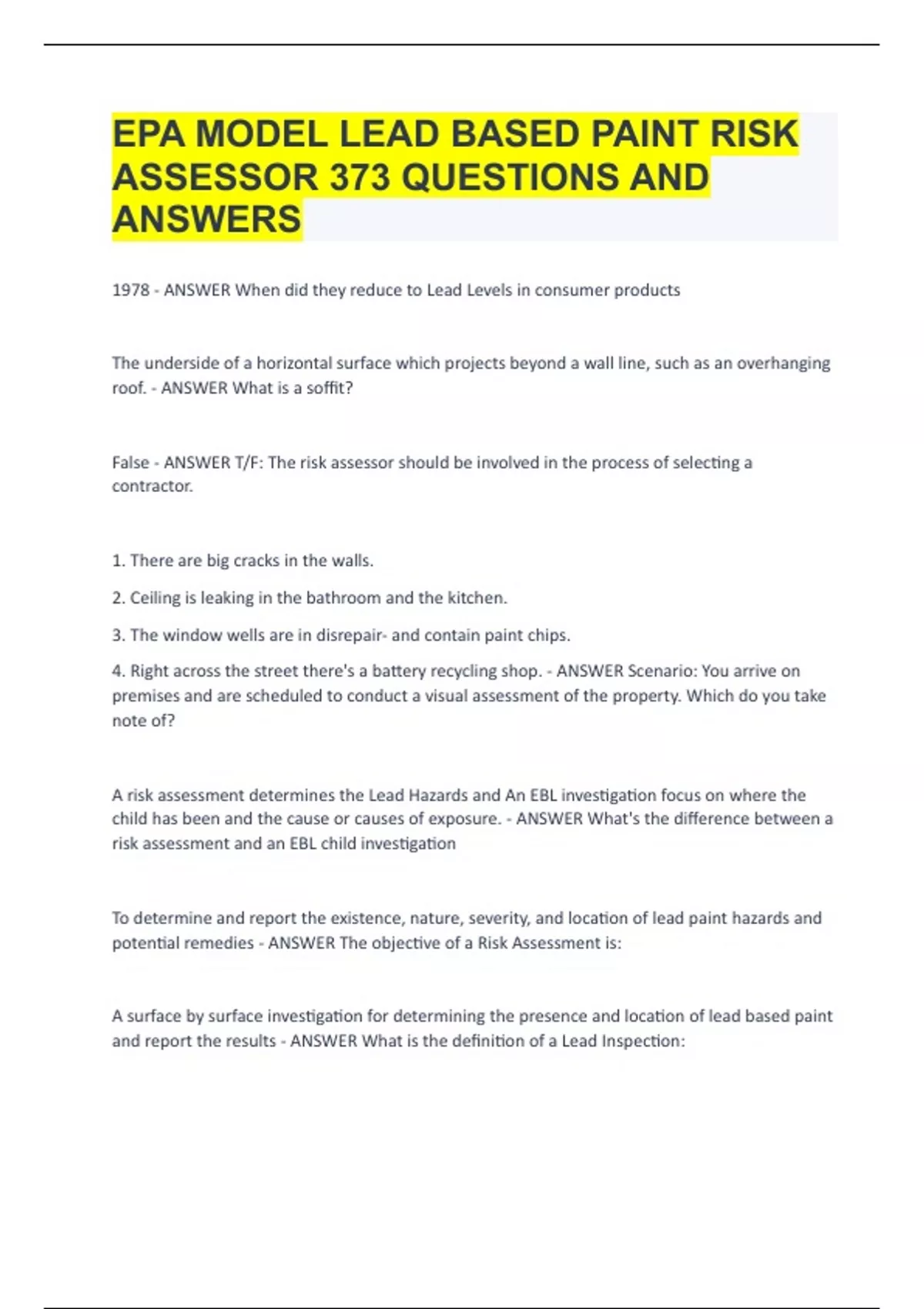 EPA MODEL LEAD BASED PAINT RISK ASSESSOR| 373 QUESTIONS AND ANSWERS.