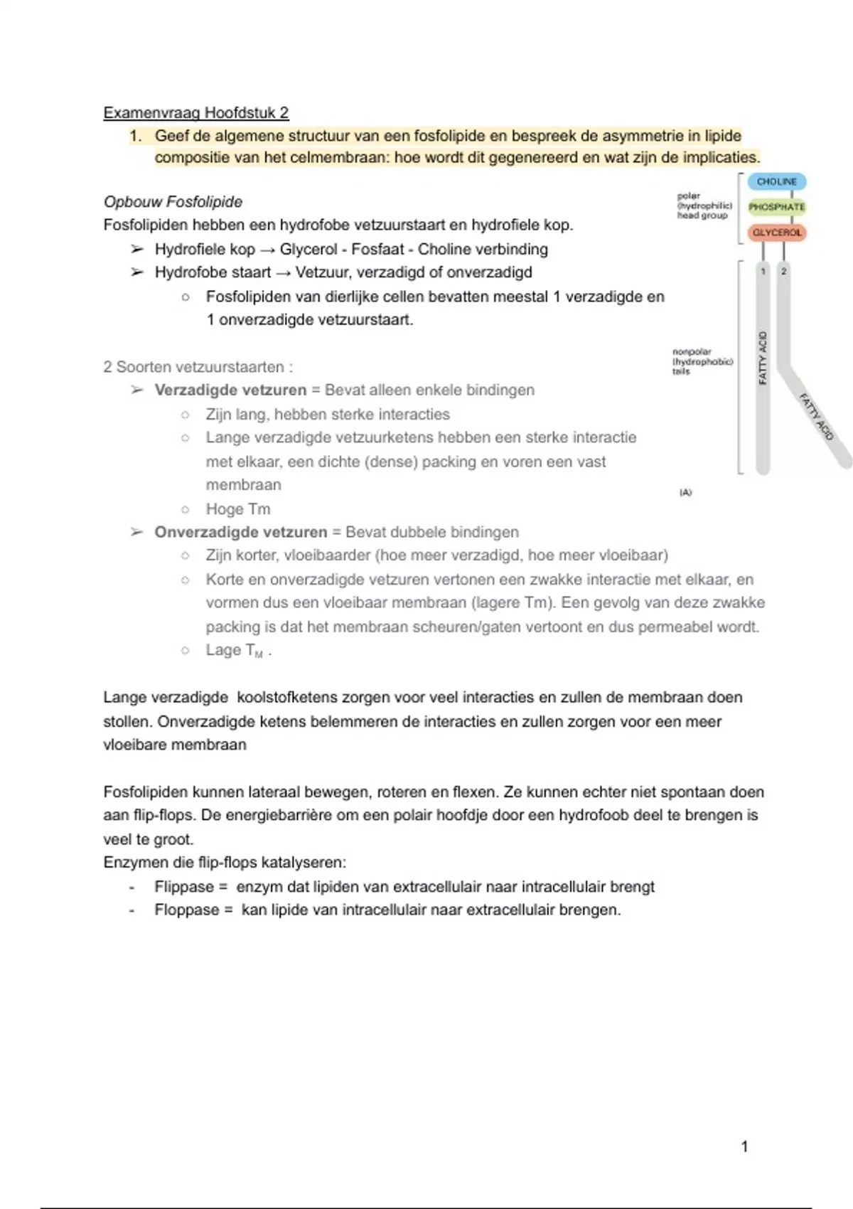 1. Geef de algemene structuur van een fosfolipide en bespreek de asymmetrie in lipide