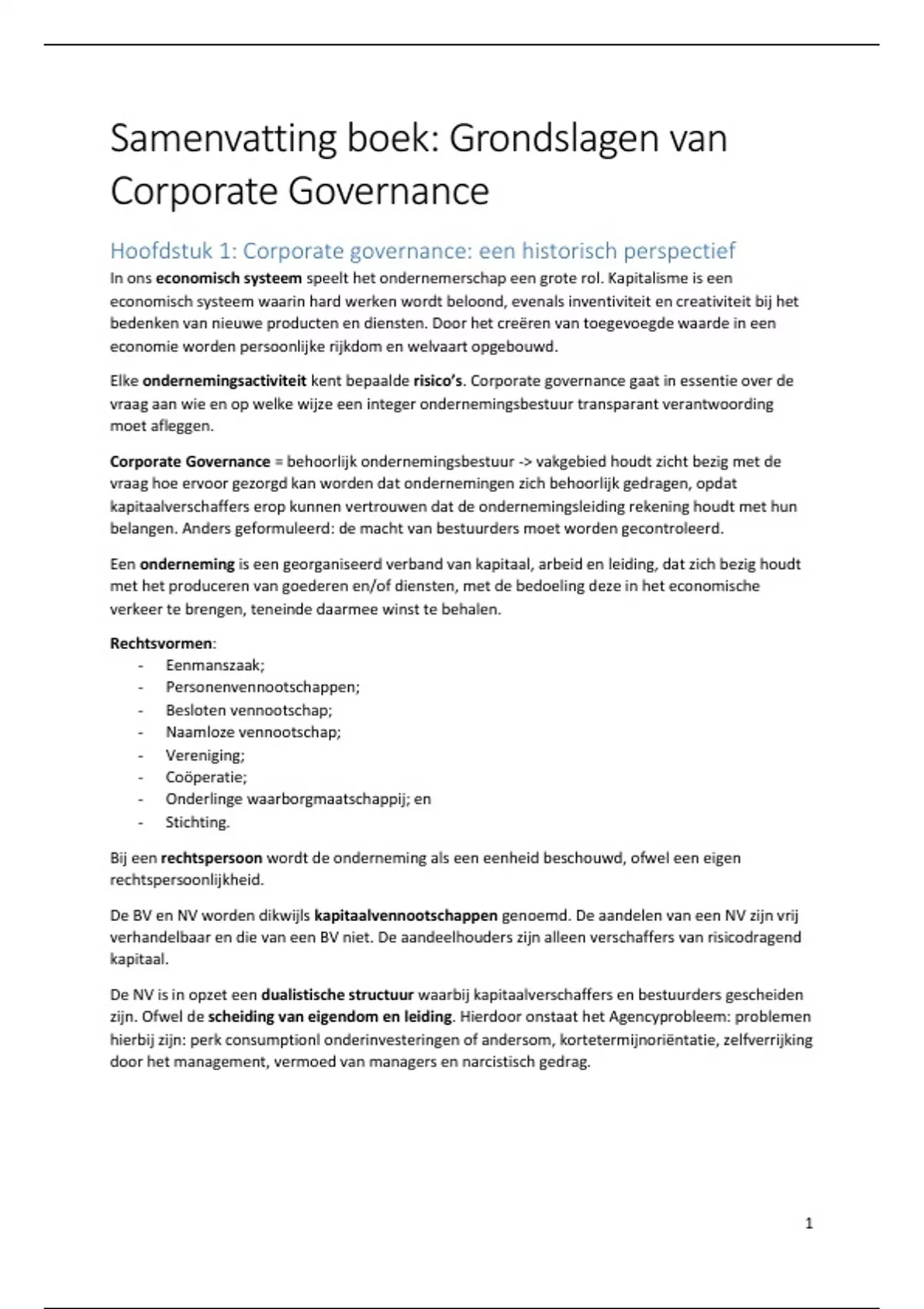 Betreft een samenvatting van de hoofdstukken van het boek Grondslagen van Corporate Governance 4e druk welke onder de tentamenstof vallen en aanvullende de wijzigingen naar de Corporate Governance Code 2022 welke niet in de boek is opgenomen.