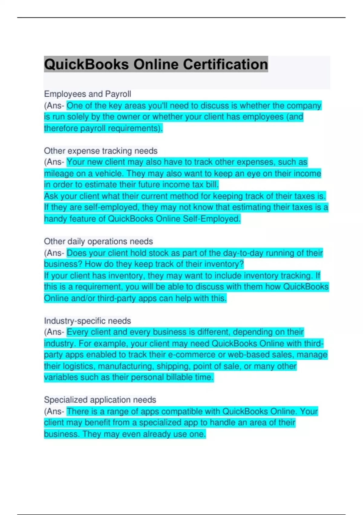 Employees and Payroll (Ans- One of the key areas you'll need to discuss is whether the company is run solely by the owner or whether your client has employees (and therefore payroll requirements). Other expense tracking needs (Ans- Your new client may also have to track other expenses, such as mileage on a vehicle. They may also want to keep an eye on their income in order to estimate their future income tax bill. Ask your client what their current method for keeping track of their taxes is. If they are self-employed, they may not know that estimating their taxes is a handy feature of QuickBooks Online Self-Employed. Other daily operations needs (Ans- Does your client hold stock as part of the day-to-day running of their business? How do they keep track of their inventory? If your client has inventory, they may want to include inventory tracking. If this is a requirement, you will be able to discuss with them how QuickBooks Online and/or third-party apps can help with this. Industry-specific needs (Ans- Every client and every business is different, depending on their industry. For example, your client may need QuickBooks Online with third-party apps enabled to track their e-commerce or web-based sales, manage their logistics, manufacturing, shipping, point of sale, or many other variables such as their personal billable time. Specialized application needs (Ans- There is a range of apps compatible with QuickBooks Online. Your client may benefit from a specialized app to handle an area of their business. They may even already use one. You will be able to use your knowledge of QuickBooks Online features to spot when a client has a requirement QuickBooks Online can't cater for on its own. That's where integrated apps come into the picture. From cloud storage to time-tracking, there's an app for just about everything. Reporting needs (Ans- This section of the New Client Checklist helps you get a clearer picture of how your client prefers to run their reports. Which reports work best for them? How often do they run and analyze their reports? As an additional feature, if the client has employees, they may wish to add users to their accounts who have reports-only access. We'll look into that in more detail later in the course.