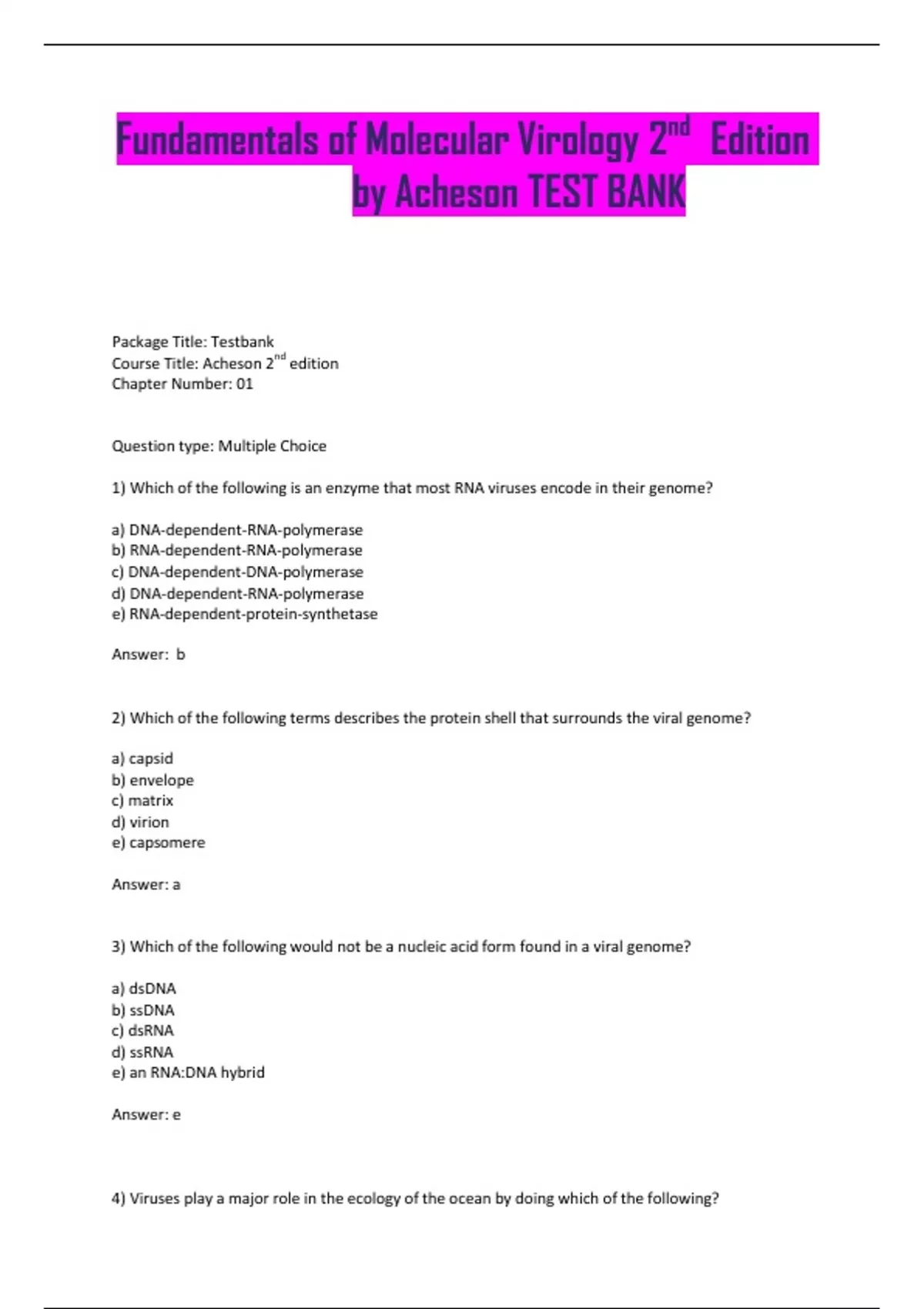 Fundamentals of Molecular Virology 2nd Edition by Acheson TEST BANK Package Title: Testbank Course Title: Acheson 2nd edition Chapter Number: 01 Question type: Multiple Choice 1) Which of the following is an enzyme that most RNA viruses encode in their genome? a) DNA-dependent-RNA-polymerase b) RNA-dependent-RNA-polymerase c) DNA-dependent-DNA-polymerase d) DNA-dependent-RNA-polymerase e) RNA-dependent-protein-synthetase Answer: b 2) Which of the following terms describes the protein shell that surrounds the viral genome? a) capsid b) envelope c) matrix d) virion e) capsomere Answer: a 3) Which of the following would not be a nucleic acid form found in a viral genome? a) dsDNA b) ssDNA c) dsRNA d) ssRNA e) an RNA:DNA hybrid Answer: e 4) Viruses play a major role in the ecology of the ocean by doing which of the following? a) By infecting photosynthetic bacteria and increasing their growth. b) By infecting harmful bacteria found in the ocean and limiting their growth. c) By killing off fish and preventing them from becoming too plentiful. d) By lysing unicellular organisms and releasing carbon and oxygen back into the ocean. e) All of the above statements are correct. Answer: d 5) If you wanted to show that an infectious agent is a virus, what experiment could you do? a) Show that the agent can be seen under a light microscope. b) Show that agent contains a lipid membrane. c) Show that the agent can form single colonies on an agar plate. d) Show that the agent can be diluted and can still cause disease in an animal. e) Show that the agent can pass through a porcelain filter and is still infectious. Answer: e 6) What does the word “virus” mean in Latin? a) infectious agent b) liquid c) poison d) death e) disease Answer: c 7) The word “phage” is a shortened version of the name of a virus that can infect which type of organism? a) bacterial cell b) human cell c) eukaryotic cell d) plant cell e) inset cell Answer: a 8) The study of which group of viruses led to the discovery of cellular genes that can promoter cancer in animal cells? a) papillomaviruses b) retroviruses c) adneoviruses d) polyomaviruses e) picornaviruses