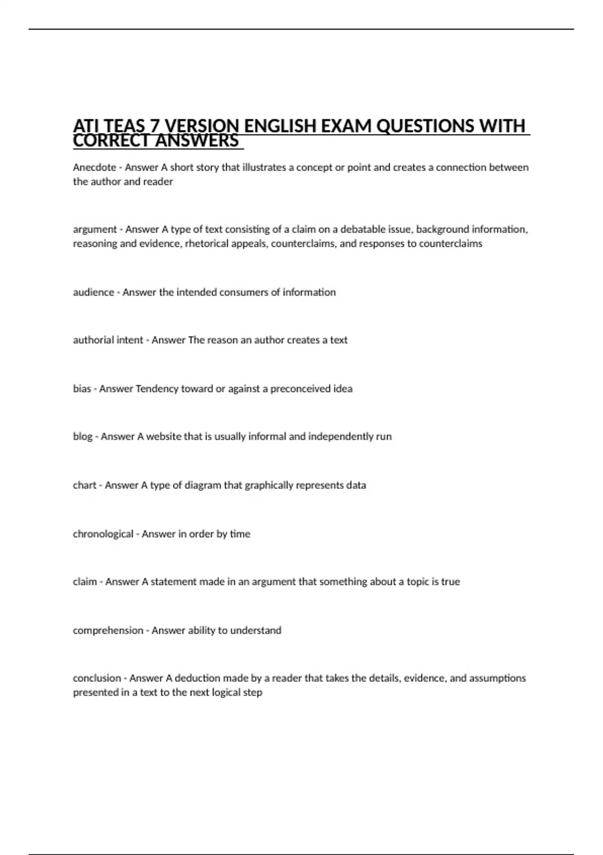 ATI TEAS 7 VERSION ENGLISH EXAM QUESTIONS WITH CORRECT ANSWERS