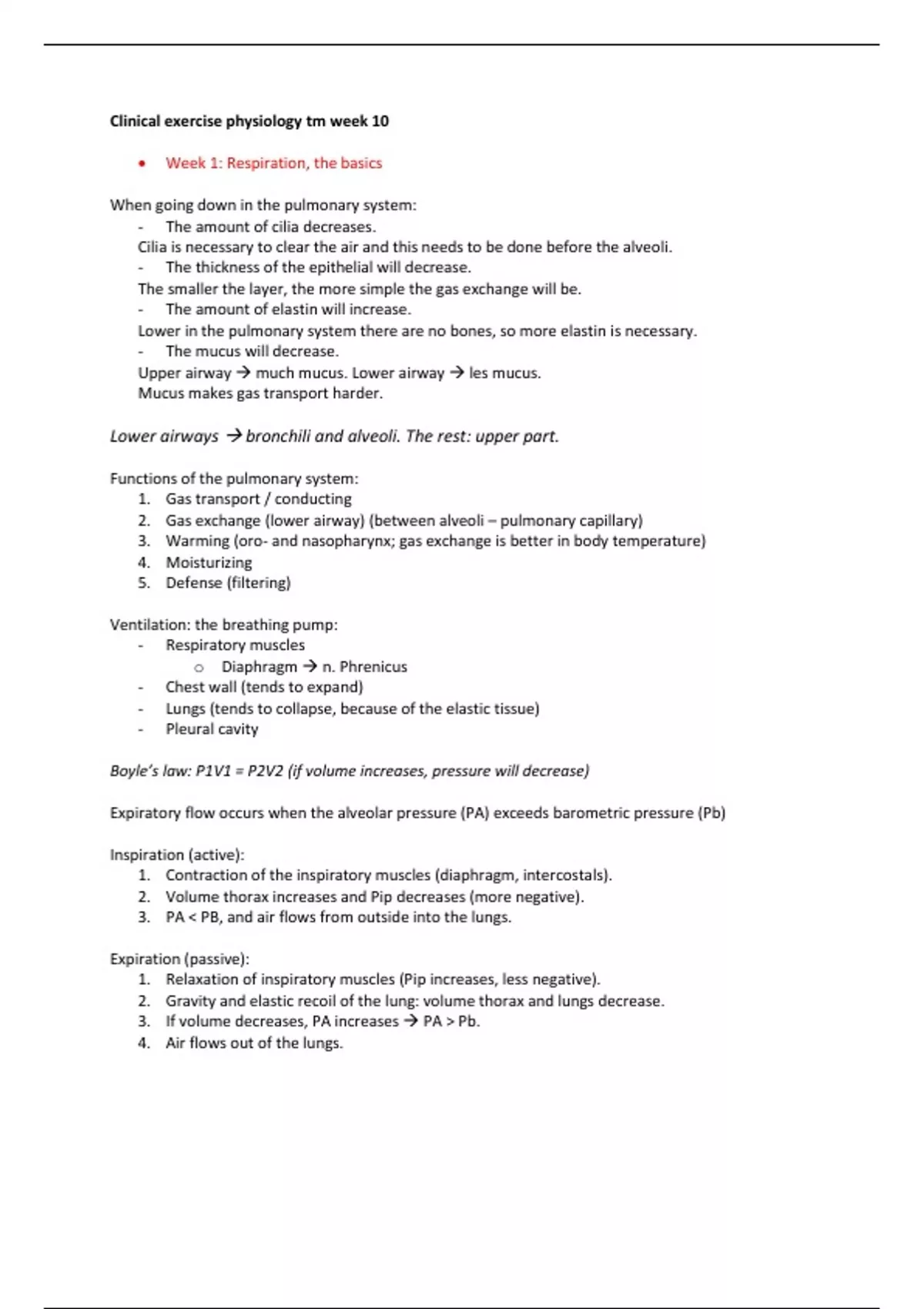 In deze samenvatting worden de hoofdlijnen van het vak Clinical Exercise Physiology omschreven. De samenvatting is opgedeeld in de verschillende weken die het vak kent. Zo komen onder andere de volgende onderdelen aan bod: respiratie, circulatie, de invloed van sporten op het lichaam, de opbouw van spieren met de invloed die sporten hierop heeft en nog veel meer. Op een eenvoudige manier geschreven, kortom de ideale voorbereiding voor het eerste tentamen van het vak!