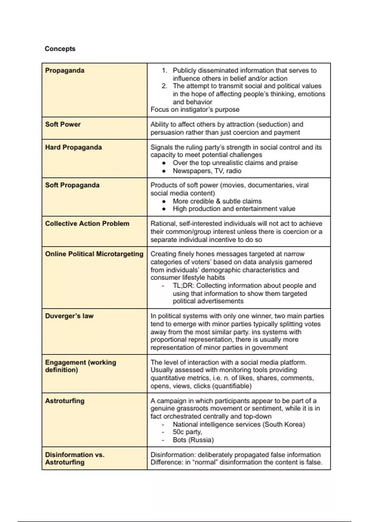 Tables containing the key concepts and the readings of the material for the final exam of politics, media & communication