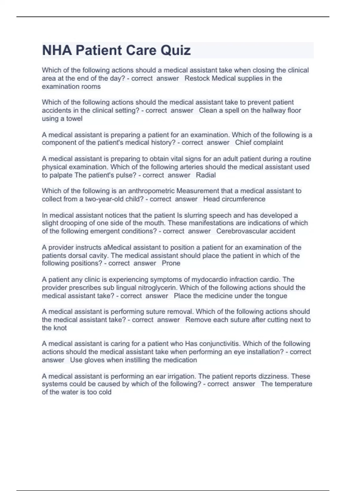 NHA Patient Care Quiz Questions with complete solution 2023Which of the following actions should a medical assistant take when closing the clinical area at the end of the day? - correct answer Restock Medical supplies in the examination rooms Which of the following actions should the medical assistant take to prevent patient accidents in the clinical setting? - correct answer Clean a spell on the hallway floor using a towel A medical assistant is preparing a patient for an examination. Which of the following is a component of the patient's medical history? - correct answer Chief complaint A medical assistant is preparing to obtain vital signs for an adult patient during a routine physical examination. Which of the following arteries should the medical assistant used to palpate The patient's pulse? - correct answer Radial Which of the following is