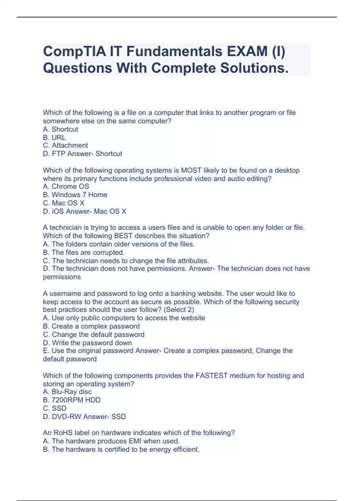 CompTIA IT Fundamentals EXAM (I) Questions With Complete Solutions.