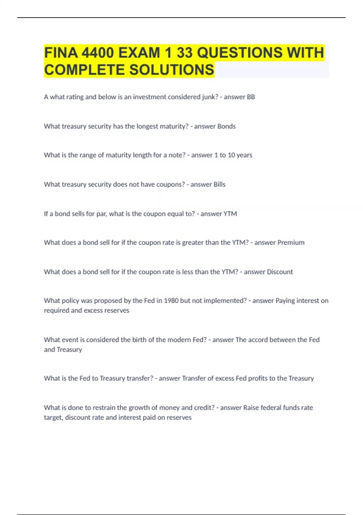 FINA 4400 EXAM 1 |33 QUESTIONS WITH COMPLETE SOLUTIONS|GUARANTEED SUCCESS