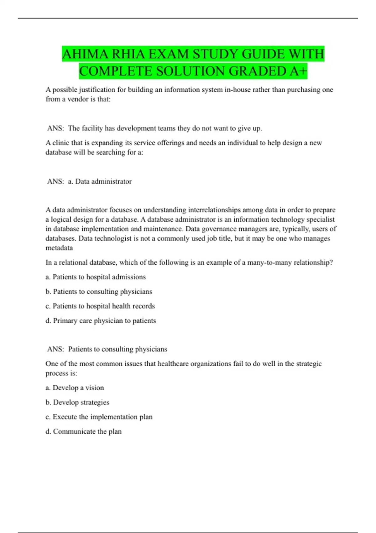 AHIMA RHIA EXAM STUDY GUIDE WITH COMPLETE SOLUTION GRADED A+