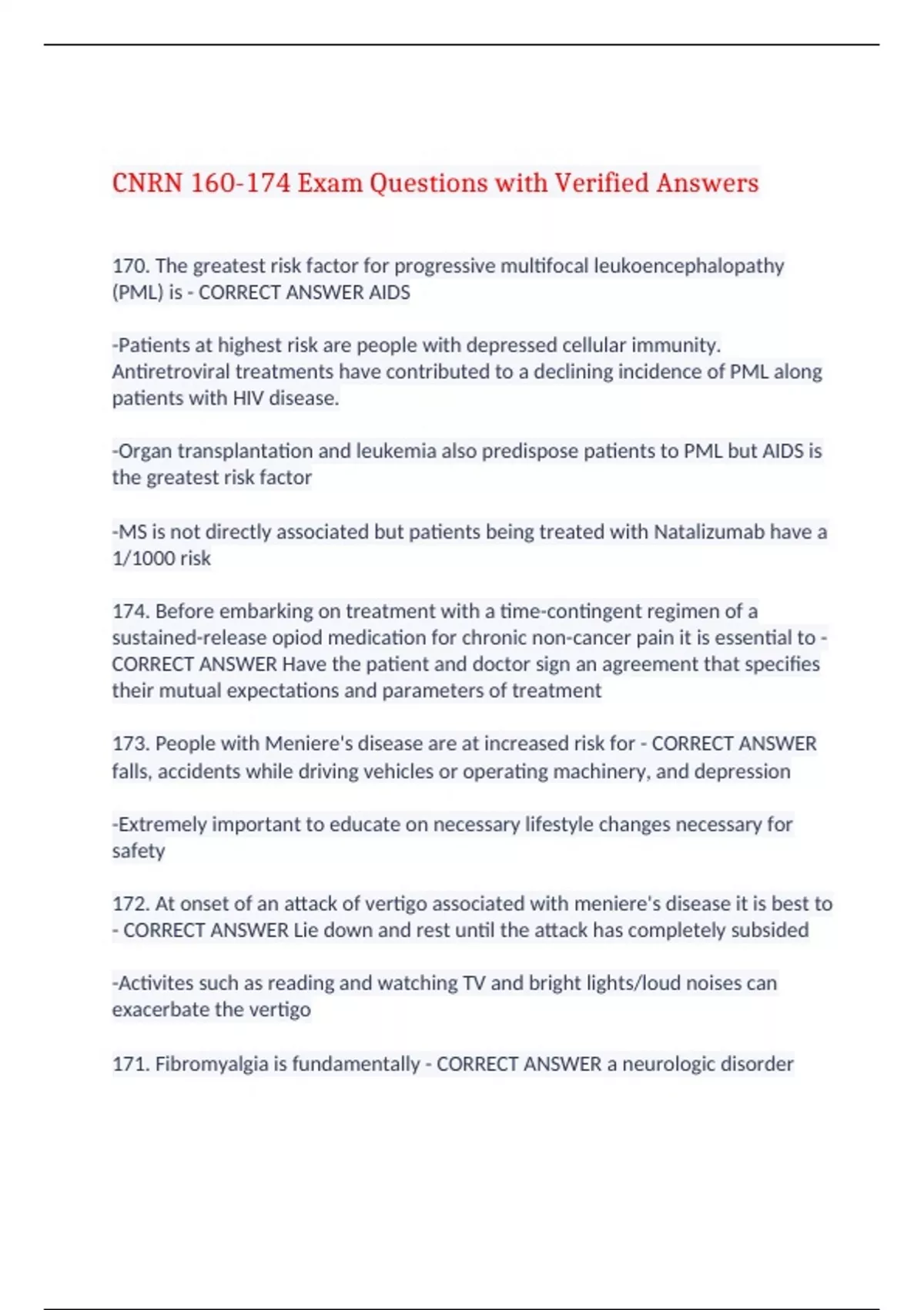 CNRN 160-174 Exam Questions with Verified Answers 170. The greatest risk factor for progressive multifocal leukoencephalopathy (PML) is - CORRECT ANSWER AIDS -Patients at highest risk are people with depressed cellular immunity. Antiretroviral treatments have contributed to a declining incidence of PML along patients with HIV disease. -Organ transplantation and leukemia also predispose patients to PML but AIDS is the greatest risk factor -MS is not directly associated but patients being treated with Natalizumab have a 1/1000 risk 174. Before embarking on treatment with a time-contingent regimen of a sustained-release opiod medication for chronic non-cancer pain it is essential to - CORRECT ANSWER Have the patient and doctor sign an agreement that specifies their mutual expectations and parameters of treatment 173. People with Meniere's disease are at increased risk for - CORRECT ANSWER falls, accidents while driving vehicles or operating machinery, and depression -Extremely important to educate on necessary lifestyle changes necessary for safety 172. At onset of an attack of vertigo associated with meniere's disease it is best to - CORRECT ANSWER Lie down and rest until the attack has completely subsided -Activites such as reading and watching TV and bright lights/loud noises can exacerbate the vertigo 171. Fibromyalgia is fundamentally - CORRECT ANSWER a neurologic disorder -The existence of fibromyalgia as a legitamate medical disorder has been disputed because of the absence of an objective diagnositc test. MRI shows hyperexcitability in central pain pathways, and reduced activity in descending central pain inhibitory pathways lending the understading fibromyalgia is a disorder of the CNS 169. MS patients treated with natalizumab (Tysabri) require intensive long term monitoring because - CORRECT ANSWER they have a 1/1000 risk of developing progressive mutlifocal leukoencephalopathy. -Although the statistical risk of progressive PML is relatively small, this diease is progressive, debilitating, and almost always fatal. For this reason it is reserved for patients whose MS has been unresponsive to standard treatment with interferons and glatiramer acetate who have made a thoroughly considered and informed choice 168. The best approach to pharmacologic management of symptoms of restless leg syndrome is usually - CORRECT ANSWER cyclic deployment of various classes of medication -The most characteristic feature of their medication response is that no agent seems to be effective for very long. Therefore cyclic deployment is known to be effective in a regimen tailored to each individuals -gabapentin, opioids, benzodiazepines, muscle relaxers -tricyclic antidepressants and anti-nausea drugs often worsen symptoms of RLS 167. Restless leg syndrome affects - CORRECT ANSWER people of all ages -Can begin at any age. Often the diagnosis is missed in early childhood and dismissed as growing pains. Symptoms often increase with age 166. When children with ADHD enter their teenage years - CORRECT ANSWER their risk for auto accidents is greater than the risk of other teens 165. A patient with HIV disease is taking isoniazid (INH), rifampin (RIF), ethambutol (EMB) and pyrazinamide (PZA). The nutritional supplement most important to include in this patient's regimen is - CORRECT ANSWER Pyridoxine (Vitamin B6) -INH can cause Pyridozine deficiency; patients hshould be instructed to take only as directed as this can be toxic at high concentrations. 164. The most common neurologic manifestation of HIV is - CORRECT ANSWER Peripheral neuropathy -Typically AIDS neuropathy is distal symmetrical polyneuropathy (DSPN) associated with advanced immunosupression and or toxicity of antiretroviral medications. Generally occurs early on in disease progression 163. Women are three times more likely than men to develop - CORRECT ANSWER carpal tunnel syndrome -realted to fluid retention in the carpal tunnel during pregnancy, diabetes, hypothyroidism, RA, and celiac disease 162. Patients with adrenoleukodystrophy lack - CORRECT ANSWER an enzyme that breaks down very long chain fatty acids -The myelin sheath in the brain is damaged by excessive amounts of very long chain fatty acids as well as the adrenal cortex 161. The family of a child with adrenoleukodystrophy (ALD) is seeking genetic counseling. Along with the requested referral, the family can be told that the inheritance of ALD is - CORRECT ANSWER Nearly always X linked recessive. -Female carriers who have one abnormal allele on one x chromosome and one normal allele on the other x chromosome are generally asymptomatic ; however they can have mild syndrome of progressive spasticity, weakness, and ataxia 160. A patient being issued crutches for any reason should be instructed in their correct use in order to avoid - CORRECT ANSWER radial nerve entrapment injury