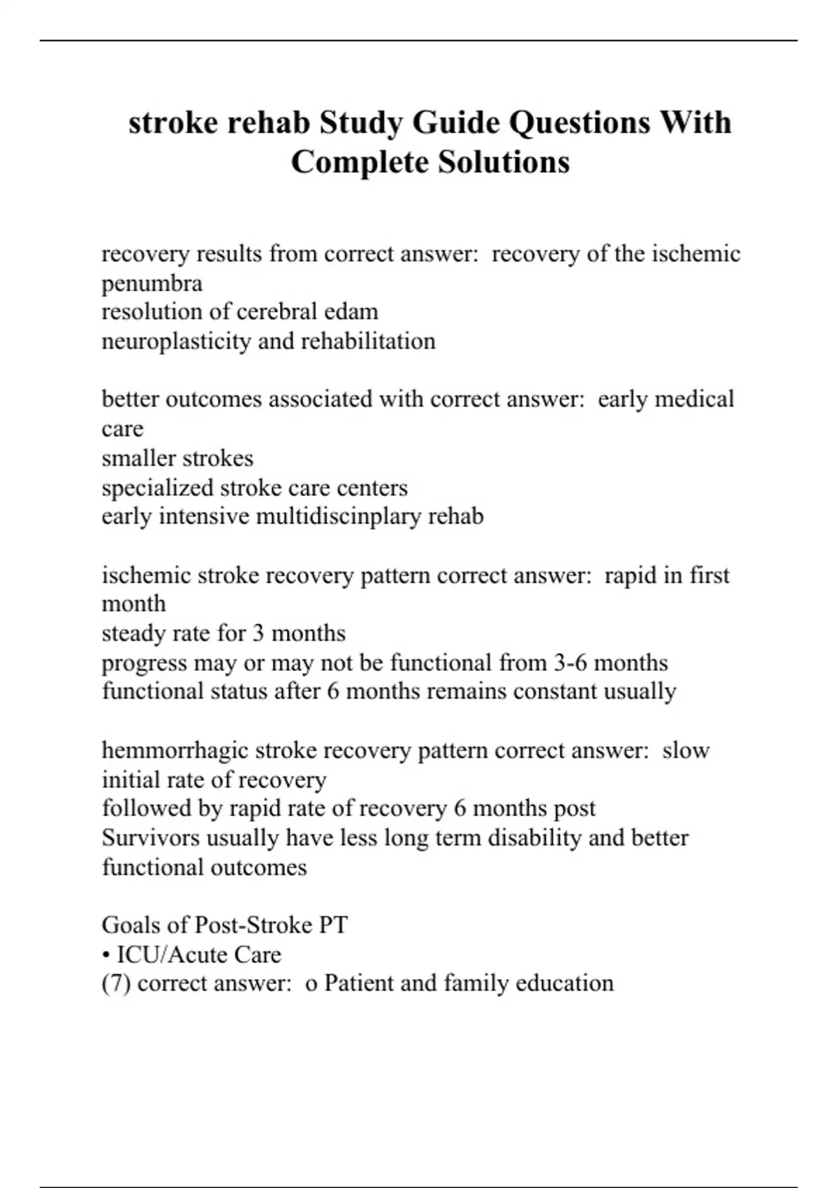 stroke rehab Study Guide Questions With Complete Solutions