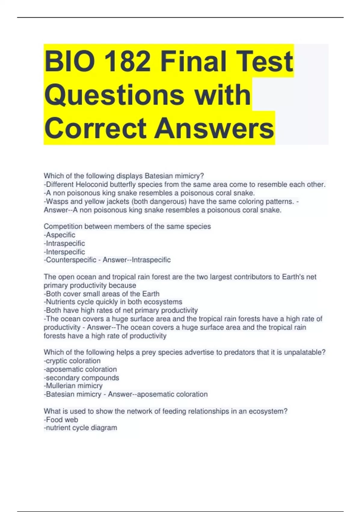 BIO 182 Final Test Questions with Correct Answers Which of the following displays Batesian mimicry? -Different Heloconid butterfly species from the same area come to resemble each other. -A non poisonous king snake resembles a poisonous coral snake. -Wasps and yellow jackets (both dangerous) have the same coloring patterns. - Answer--A non poisonous king snake resembles a poisonous coral snake. Competition between members of the same species -Aspecific -Intraspecific -Interspecific -Counterspecific - Answer--Intraspecific The open ocean and tropical rain forest are the two largest contributors to Earth's net primary productivity because -Both cover small areas of the Earth -Nutrients cycle quickly in both ecosystems -Both have high rates of net primary productivity -The ocean covers a huge surface area and the tropical rain forests have a high rate of productivity - Answer--The ocean covers a huge surface area and the tropical rain forests have a high rate of productivity Which of the following helps a prey species advertise to predators that it is unpalatable? -cryptic coloration -aposematic coloration -secondary compounds -Mullerian mimicry -Batesian mimicry - Answer--aposematic coloration What is used to show the network of feeding relationships in an ecosystem? -Food web -nutrient cycle diagram -Food chain -Trophic levels - Answer--Food chain What type of organism eats both producers and consumers? -omnivore -decomposer -producer -consumer - Answer--omnivore Which of the following helps a prey species avoid being detected by a predator? -cryptic coloration -secondary compounds -aposematic coloration -Mullerian mimicry -Batesian mimicry - Answer--cryptic coloration