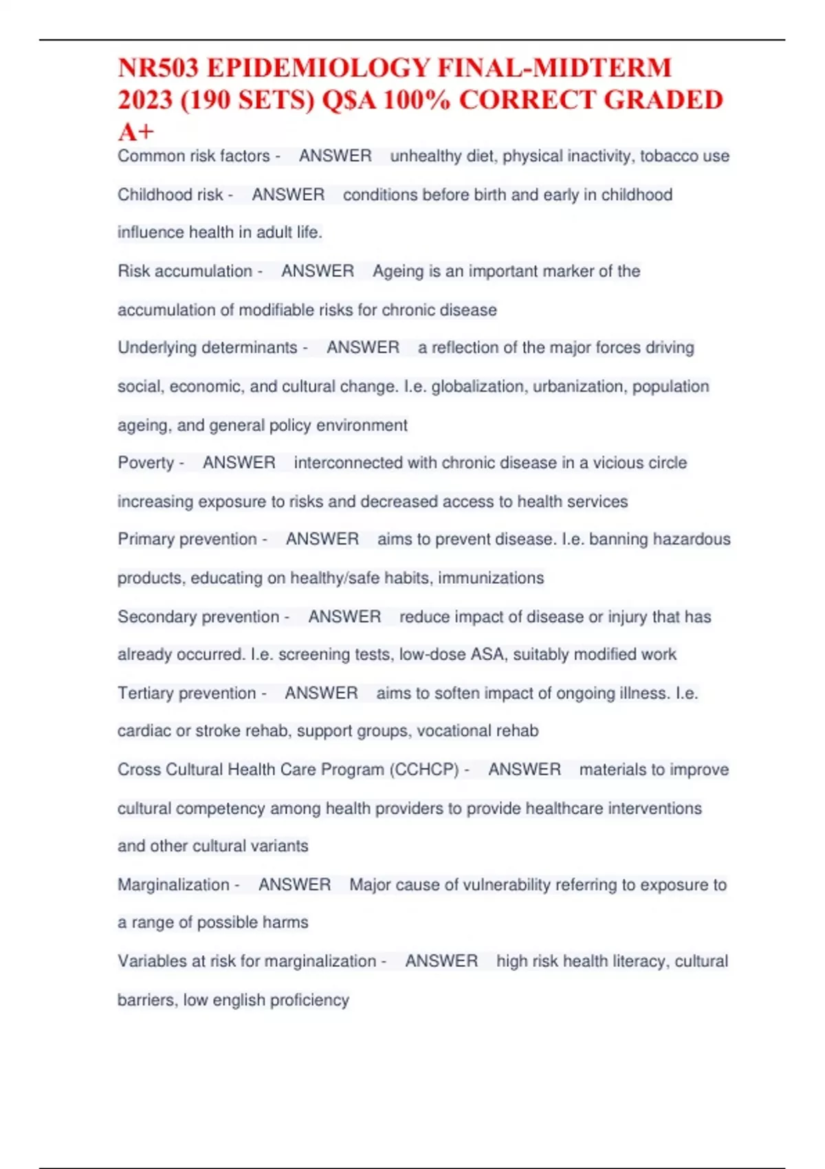 NR503 EPIDEMIOLOGY FINAL-MIDTERM 2023 (190 SETS) Q$A 100% CORRECT GRADED A+ Common risk factors - ANSWER unhealthy diet, physical inactivity, tobacco use Childhood risk - ANSWER conditions before birth and early in childhood influence health in adult life. Risk accumulation - ANSWER Ageing is an important marker of the accumulation of modifiable risks for chronic disease Underlying determinants - ANSWER a reflection of the major forces driving social, economic, and cultural change. I.e. globalization, urbanization, population ageing, and general policy environment Poverty - ANSWER interconnected with chronic disease in a vicious circle increasing exposure to risks and decreased access to health services Primary prevention - ANSWER aims to prevent disease. I.e. banning hazardous products, educating on healthy/safe habits, immunizations Secondary prevention - ANSWER reduce impact of disease or injury that has already occurred. I.e. screening tests, low-dose ASA, suitably modified work Tertiary prevention - ANSWER aims to soften impact of ongoing illness. I.e. cardiac or stroke rehab, support groups, vocational rehab Cross Cultural Health Care Program (CCHCP) - ANSWER materials to improve cultural competency among health providers to provide healthcare interventions and other cultural variants Marginalization - ANSWER Major cause of vulnerability referring to exposure to a range of possible harms Variables at risk for marginalization - ANSWER high risk health literacy, cultural barriers, low english proficiency