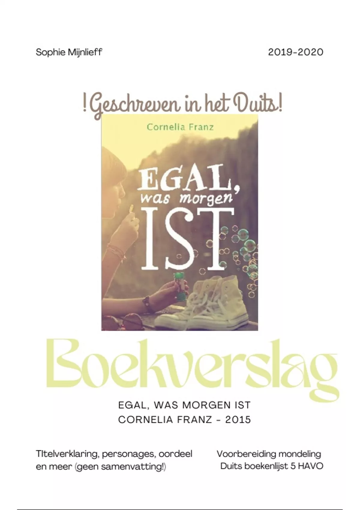 Voor mijn boekenlijst en mondeling voor Duits, heb ik in 5 havo dit boekverslag geschreven over Egal, was morgen ist van Cornelia Franz. Dit is een relatief goed te lezen Duits boek. Dit verslag is de ideale voorbereiding op het mondeling. Het is in het Duits geschreven (!) en bevat de volgende gegevens: hoofdpersoon, bijpersonen, emotionele relatie tot de personages, waar/wanneer speelt het verhaal zich af, hoe lang duurt het verhaal, probleem/kern van de handeling in het verhaal, oplossing, titelverklaring, taalgebruik, mijn oordeel en reden boekkeuze. Zie mijn profiel voor meer Nederlandse en Duitse boekverslagen.