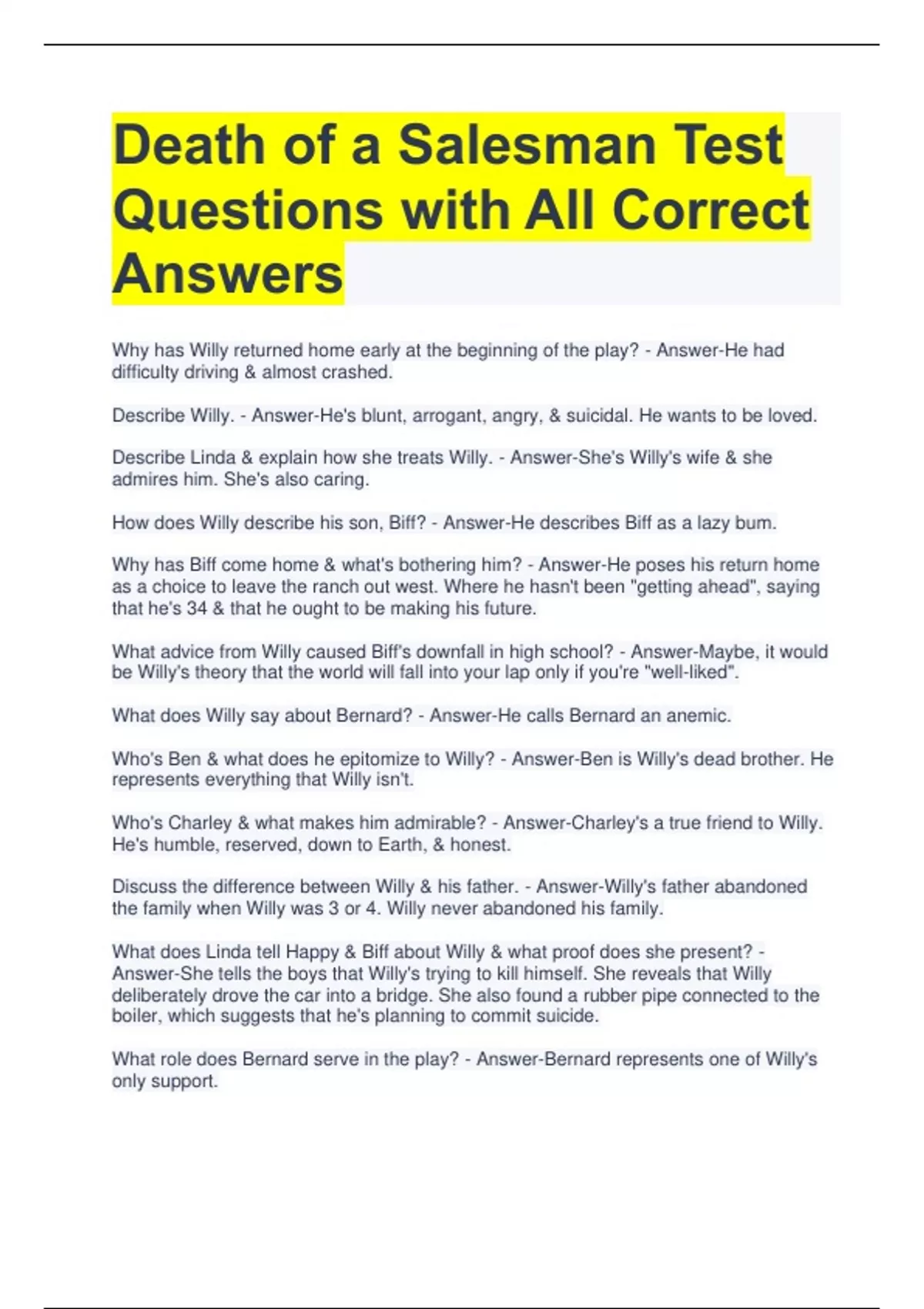 Death of a Salesman Test Questions with All Correct Answers Why has Willy returned home early at the beginning of the play? - Answer-He had difficulty driving & almost crashed. Describe Willy. - Answer-He's blunt, arrogant, angry, & suicidal. He wants to be loved. Describe Linda & explain how she treats Willy. - Answer-She's Willy's wife & she admires him. She's also caring. How does Willy describe his son, Biff? - Answer-He describes Biff as a lazy bum. Why has Biff come home & what's bothering him? - Answer-He poses his return home as a choice to leave the ranch out west. Where he hasn't been "getting ahead", saying that he's 34 & that he ought to be making his future. What advice from Willy caused Biff's downfall in high school? - Answer-Maybe, it would be Willy's theory that the world will fall into your lap only if you're "well-liked". What does Willy say about Bernard? - Answer-He calls Bernard an anemic. Who's Ben & what does he epitomize to Willy? - Answer-Ben is Willy's dead brother. He represents everything that Willy isn't. Who's Charley & what makes him admirable? - Answer-Charley's a true friend to Willy. He's humble, reserved, down to Earth, & honest. Discuss the difference between Willy & his father. - Answer-Willy's father abandoned the family when Willy was 3 or 4. Willy never abandoned his family. What does Linda tell Happy & Biff about Willy & what proof does she present? - Answer-She tells the boys that Willy's trying to kill himself. She reveals that Willy deliberately drove the car into a bridge. She also found a rubber pipe connected to the boiler, which suggests that he's planning to commit suicide. What role does Bernard serve in the play? - Answer-Bernard represents one of Willy's only support. Who's Dave Singleman & what does he represent to Willy? - Answer-He's an 84-year old salesman who phoned his buyers & made all of his sales. He does so without leaving his hotel room. He represents .5 of American Dream for Willy. What's the significance of the title? - Answer-It suggests that Willy dies in the end. Why does Howard seem insensitive to Willy's hardships? - Answer-He tells Willy that he's got to see some people & that he's busy.