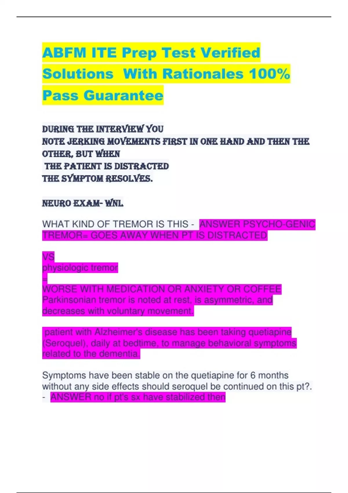 ABFM ITE Prep Test Verified Solutions With Rationales 100% Pass Guarantee During the interview you note jerking movements first in one hand and then the other, but when the patient is distracted the symptom resolves. NEURO EXAM- WNL WHAT KIND OF TREMOR IS THIS - ANSWER PSYCHO-GENIC TREMOR= GOES AWAY WHEN PT IS DISTRACTED VS physiologic tremor = WORSE WITH MEDICATION OR ANXIETY OR COFFEE Parkinsonian tremor is noted at rest, is asymmetric, and decreases with voluntary movement. patient with Alzheimer's disease has been taking quetiapine (Seroquel), daily at bedtime, to manage behavioral symptoms related to the dementia. Symptoms have been stable on the quetiapine for 6 months without any side effects should seroquel be continued on this pt?. - ANSWER no if pt's sx have stabilized then ANTI-PSYCHOTIC MEDICATIONS SHOULD BE TAPERED DOWN WITH GOAL OF DISCONTINUATION This is recommended because antipsychotic medications have adverse effects ESPECIALLY IN ELDERLY NURSE TRAVELING TO COUNTRY WITH HIGH TB PREVALANCE TB TEST PRIOR TO TRAVEL IS NEGATIVE Assuming she remains asymptomatic, which one of the following would you recommend? A) Prophylactic treatment with isoniazid starting 1 month prior to departure and continuing throughout her trip B) Prophylactic treatment with rifampin (Rifadin) starting 1 month prior to departure and continuing throughout her trip C) A repeat TB skin test 2 months after she returns D) A chest radiograph 2 months after she returns E) An interferon-gamma release assay (IGRA) 6 months after she returns 9. - ANSWER C) A repeat TB skin test 2 months after she returns DON'T NEED TO TX FOR LATENT TB IS NO SX, TB TEST ENGATIVE DO NOT RE-TEST FOR TB UPON RETURN IMMEDIATELY INSTEAD WAIT 2 MONTHS discuss FIRST AND SECOND HEART BLOCK - ANSWER 1ST DEGREE= NO MISSED BEATS= ONLY PR INTERVAL= PROLONGED= FIXED 2ND DEGREE TYPE 1/WENKEBACH= MISSED BEAT + PR INTERVAL THAT'S GETTING LONGER 2ND DEGREE TYPE 2/MOBITZ- MISSED BEAT= NOTHING WRONG WITH P INTERVAL PT WITH CAD UNABLE TO TOLERATE ATORVASTATIN Which one of the following would you recommend? A) Evolocumab (Repatha) B) Ezetimibe/simvastatin (Vytorin) C) Fenofibrate (Tricor) D) Niacin E) Omega-3 fatty acid supplements 4 - ANSWER B) Ezetimibe/simvastatin (Vytorin) SWITCH HIGH INTESITY STATIN WITH A MODERATE INTENSITY STATIN SUCH AS SIMVASTATIN/PARVASTATIN