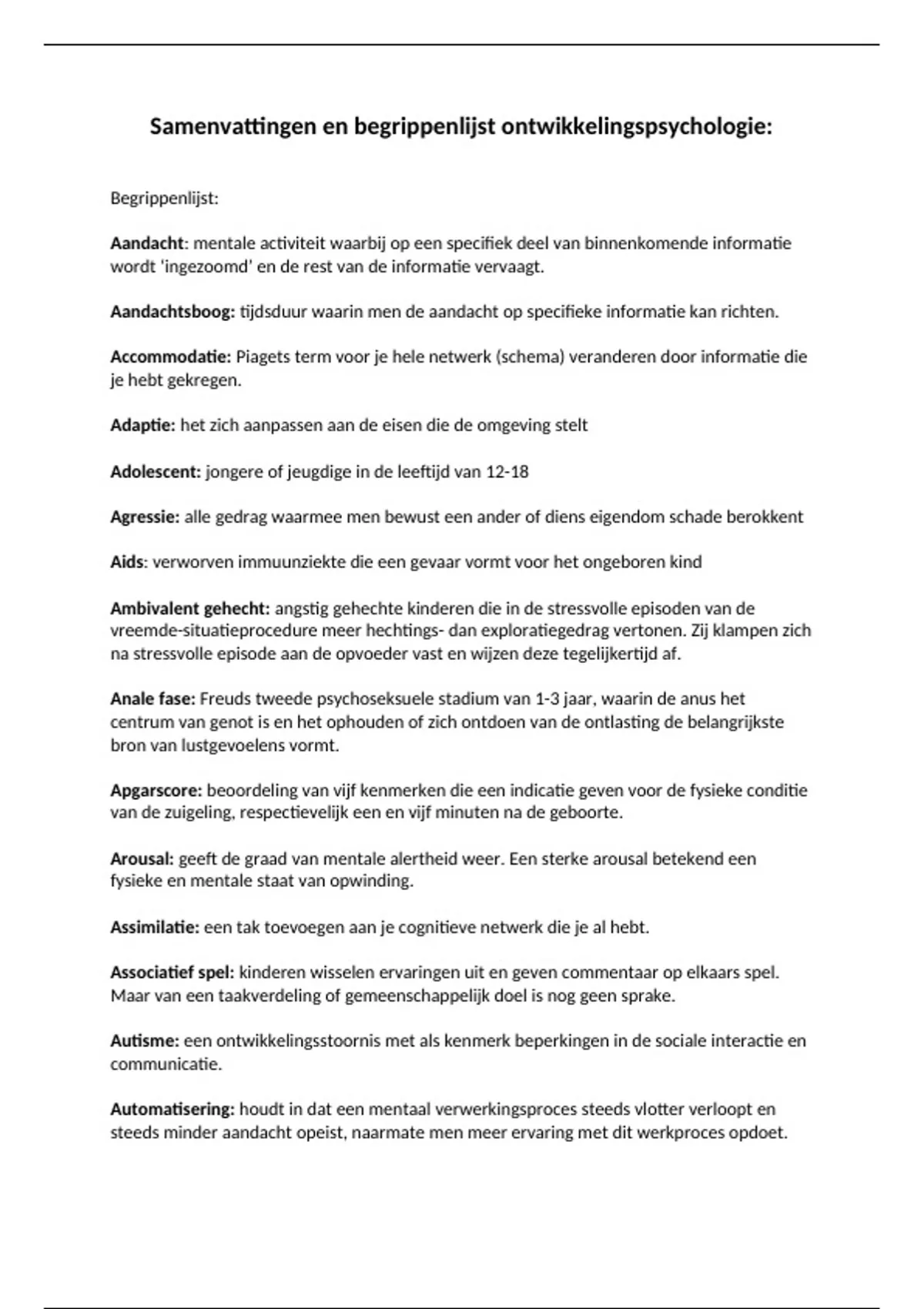 Samenvattingen en begrippenlijst ontwikkelingspsychologie: