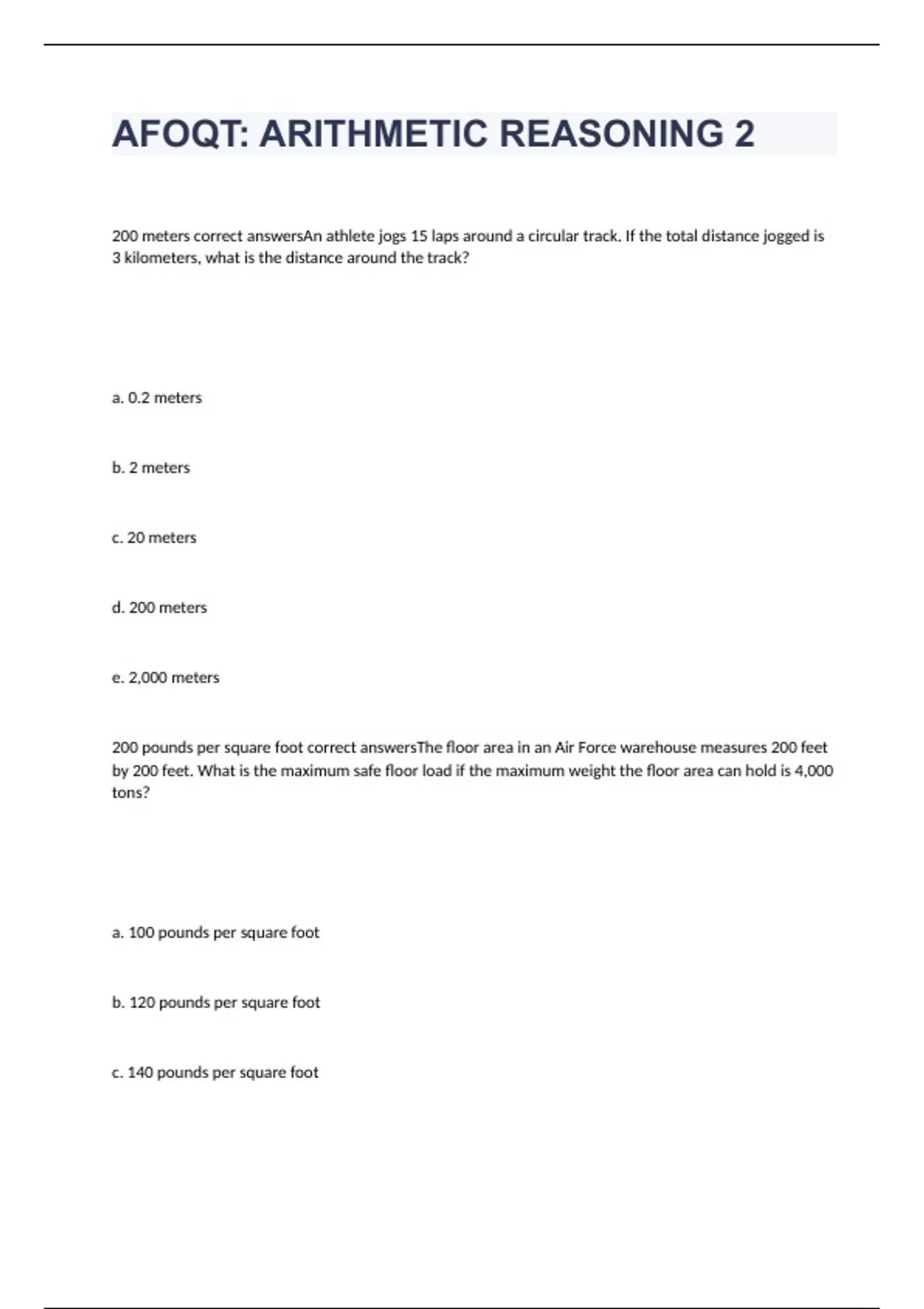 200 meters correct answersAn athlete jogs 15 laps around a circular track. If the total distance jogged is 3 kilometers, what is the distance around the track? a. 0.2 meters b. 2 meters c. 20 meters d. 200 meters e. 2,000 meters 200 pounds per square foot correct answersThe floor area in an Air Force warehouse measures 200 feet by 200 feet. What is the maximum safe floor load if the maximum weight the floor area can hold is 4,000 tons? a. 100 pounds per square foot b. 120 pounds per square foot c. 140 pounds per square foot