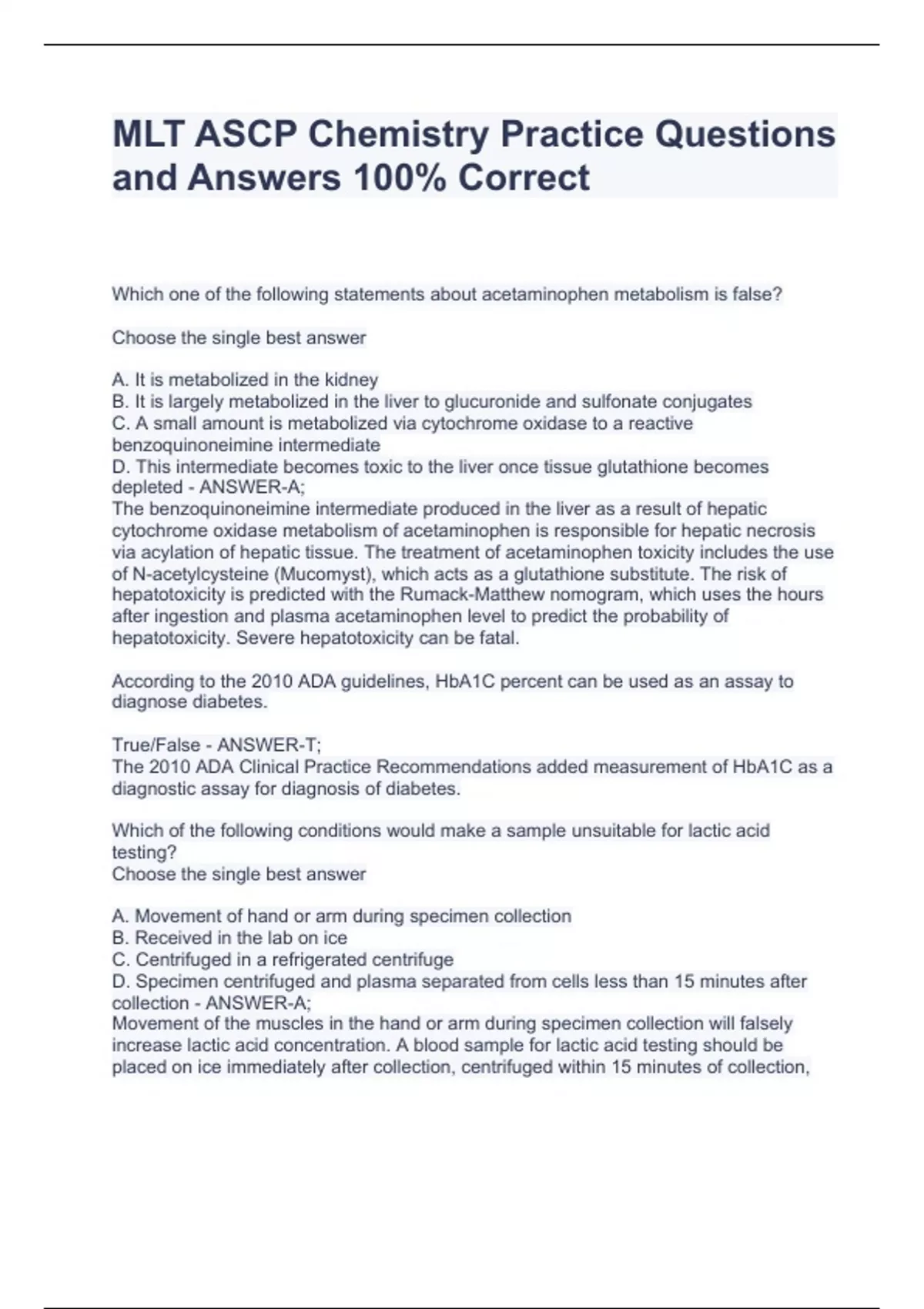 MLT ASCP Chemistry Practice Questions and Answers 100% Correct MLT ASCP Chemistry Practice Questions and Answers 100% Correct MLT ASCP Chemistry Practice Questions and Answers 100% Correct Which one of the following statements about acetaminophen metabolism is false? Choose the single best answer A. It is metabolized in the kidney B. It is largely metabolized in the liver to glucuronide and sulfonate conjugates C. A small amount is metabolized via cytochrome oxidase to a reactive benzoquinoneimine intermediate D. This intermediate becomes toxic to the liver once tissue glutathione becomes depleted - ANSWER-A; The benzoquinoneimine intermediate produced in the liver as a result of hepatic cytochrome oxidase metabolism of acetaminophen is responsible for hepatic necrosis via acylation of hepatic tissue. The treatment of acetaminophen toxicity includes the use of N-acetylcysteine (Mucomyst), which acts as a glutathione substitute. The risk of hepatotoxicity is predicted with the Rumack-Matthew nomogram, which uses the hours after ingestion and plasma acetaminophen level to predict the probability of hepatotoxicity. Severe hepatotoxicity can be fatal. According to the 2010 ADA guidelines, HbA1C percent can be used as an assay to diagnose diabetes. True/False - ANSWER-T; The 2010 ADA Clinical Practice Recommendations added measurement of HbA1C as a diagnostic assay for diagnosis of diabetes. Which of the following conditions would make a sample unsuitable for lactic acid testing? Choose the single best answer A. Movement of hand or arm during specimen collection B. Received in the lab on ice C. Centrifuged in a refrigerated centrifuge D. Specimen centrifuged and plasma separated from cells less than 15 minutes after collection - ANSWER-A; Movement of the muscles in the hand or arm during specimen collection will falsely increase lactic acid concentration. A blood sample for lactic acid testing should be