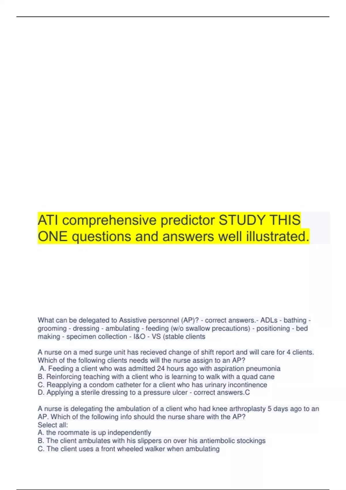 ATI comprehensive predictor STUDY THIS ONE questions and answers well illustrated. What can be delegated to Assistive personnel (AP)? - correct answers.- ADLs - bathing - grooming - dressing - ambulating - feeding (w/o swallow precautions) - positioning - bed making - specimen collection - I&O - VS (stable clients A nurse on a med surge unit has recieved change of shift report and will care for 4 clients. Which of the following clients needs will the nurse assign to an AP? A. Feeding a client who was admitted 24 hours ago with aspiration pneumonia B. Reinforcing teaching with a client who is learning to walk with a quad cane C. Reapplying a condom catheter for a client who has urinary incontinence D. Applying a sterile dressing to a pressure ulcer - correct answers.C A nurse is delegating the ambulation of a client who had knee arthroplasty 5 days ago to an AP. Which of the following info should the nurse share with the AP? Select all: A. the roommate is up independently B. The client ambulates with his slippers on over his antiembolic stockings C. The client uses a front wheeled walker when ambulating D. The client had pain meds 30 minutes ago E. The client is allergic to codeine F. the client ate 50 % of his breakfast this morning - correct answers.B C D An RN is making assignments for client care to an LPN at the beginning of the shift. Which of the following assignments should the LPN question? A. Assisting a client who is 24 hr postop to use an incentive spirometer B. Collecting a clean catch urine specimen from a client who was admitted on the previous shift C. providing nasopharyngeal suctioning for a client who has pneumonia D. Replacing the cartridge and tubing on a PCA pump - correct answers.D A nurse is preparing an inservice program about delegation. Which of the following elements should she identify when presenting the 5 rights of delegation. Select all: A. Right client B. Right supervision/evaluation C. Right direction/communication D. Right time E. Right circumstances - correct answers.B C E A nurse manager of a med surge unit is assigning care responsibilities for the oncoming shift. A client is waiting transfer back to the unit from the PACU following thoracic surgery. To which staff member should the nurse assign the client? A. Charge nurse B. RN C. LVN D. AP - correct answers.B What is the study of conduct and character? - correct answers.Ethics What are the values and beliefs that guide behavior and decision making? - correct answers.Morals What is the right to make ones own personal decisions, even tho those decisions might not be in the persons best interest - correct answers.Autonomy What are positive actions to help others - correct answers.Beneficience What is an agreement to keep promises - correct answers.Fidelity What is fairness in care delivery and use of resources - correct answers.Justice What is avoidance of harm or injury - correct answers.Non-maleficence A nurse is caring for a client who decides not to have surgery despite significant blockages in his coronary arteries. The nurse understands that this clients choice is an example of what principles? A. Fidelity B. Autonomy C. Justice D. Nonmalificience - correct answers.A A nurse offers pain meds to a client who is postop prior to ambulation. The nurse understands that this aspect of care delivery is an example of which of the following ethical principles? A. Fidelity B. Autonomy C. Justice D. Beneficience - correct answers.D A nurse is instructing a group of nursing students about the responsibilities involved with organ donation and procurement. When the nurse explains that all clients waiting for a kidney transplant have to meet the same qualifications, the students should understand that this aspect of care delivery is an example of which ethical principle A. Fidelity B. Autonomy C. Justice D. Nonmaleficence - correct answers.C A nurse questions a med prescription as too extreme and light of the clients advanced age and unstable status. The nurse understands that this action is an example of which ethical principle A. Fidelity B. Autonomy C. Justice D. Nonmalificence - correct answers.D Which of the following situations can be identified as an ethical dilemma? A. A nurse on a med surge unit demonstrates signs of chemical impairment B. A nurse over hears another nurse telling an older adult client that if he doesnt stay in bed she will restrain him C. A family has conflicting feelings about the initiation of enteral tube feedings of their father who is terminally ill D. A client who is terminally ill hesitates to name her spouse on her durable power of attorney form - correct answers.C Most managers can be categorized as - correct ritative, democratic, and laissez faire makes decisions of the group motivates by coercion communication occurs down the chain of command Work output by the staff is usually high-good for crisis situations and bureaucratic settings - correct answers.Authoritative includes the group when decisions are made Motivates by supporting star achievements Communication occurs up and down the chain of command Work output by staff is usually of good quality-good when cooperation and collaboration is necessary - correct answers.Democratic makes very few decisions and does little planning motivation is largely the responsibility of individuals staff members Communication occurs up and down the chain of command and between group members Work output is low unless an informal leader evolves from the group *the use of any of these styles may be appropriate depending on the situation - correct answers.Laissez faire The nurse should consider the hierarchy of human needs when prioritizing interventions, which are? - correct answers.- Physiological needs first (oxygen, shelter, food) - Safety & security needs (physical safety) - Love and belonging - Self esteem - Self actualization The ABC framework identifies, in order, the three basic needs for sustaining life - correct answers.Airway Breat