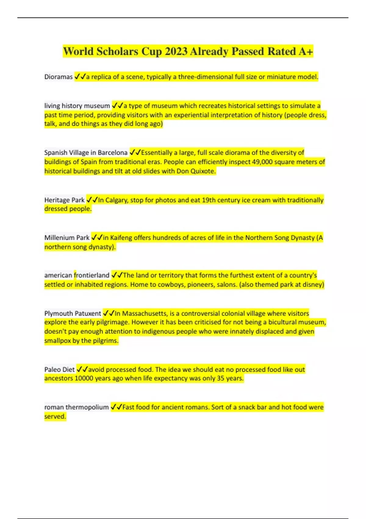 Dioramas a replica of a scene, typically a three-dimensional full size or miniature model. living history museum a type of museum which recreates historical settings to simulate a past time period, providing visitors with an experiential interpretation of history (people dress, talk, and do things as they did long ago) Spanish Village in Barcelona Essentially a large, full scale diorama of the diversity of buildings of Spain from traditional eras. People can efficiently inspect 49,000 square meters of historical buildings and tilt at old slides with Don Quixote. Heritage Park In Calgary, stop for photos and eat 19th century ice cream with traditionally dressed people. Millenium Park in Kaifeng offers hundreds of acres of life in the Northern Song Dynasty (A northern song dynasty). american frontierland The land or territory that forms the furthest extent of a country's settled or inhabited regions. Home to cowboys, pioneers, salons. (also themed park at disney) Plymouth Patuxent In Massachusetts, is a controversial colonial village where visitors explore the early pilgrimage. However it has been criticised for not being a bicultural museum, doesn't pay enough attention to indigenous people who were innately displaced and given smallpox by the pilgrims. Paleo Diet avoid processed food. The idea we should eat no processed food like out ancestors 10000 years ago when life expectancy was only 35 years. roman thermopolium Fast food for ancient romans. Sort of a snack bar and hot food were served.