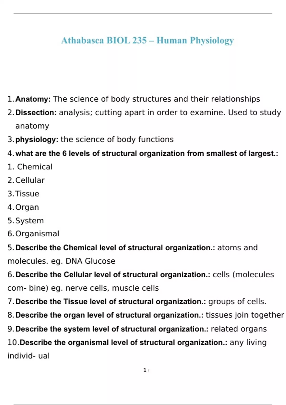 Athabasca BIOL 235 – Human Physiology (1-10) with complete solution